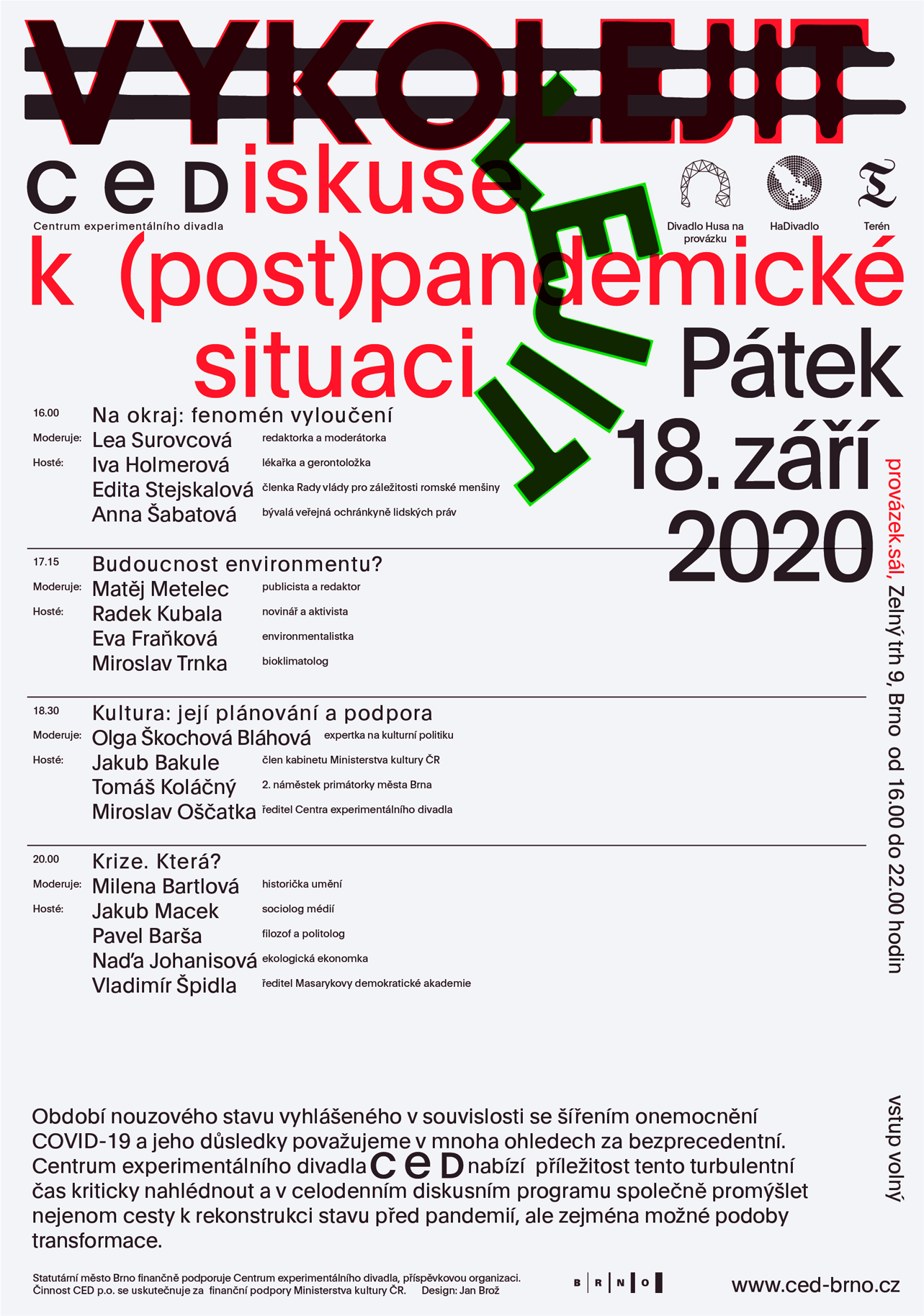 Centrum experimentálního divadla nabízí jedinečnou příležitost tento turbulentní čas kriticky nahlédnout a společně promýšlet nejenom cesty k rekonstrukci stavu před pandemií, ale zejména možné podoby transformace - vědomého vykolejení z dosavadních tras uvažování a forem sebeorganizace.
