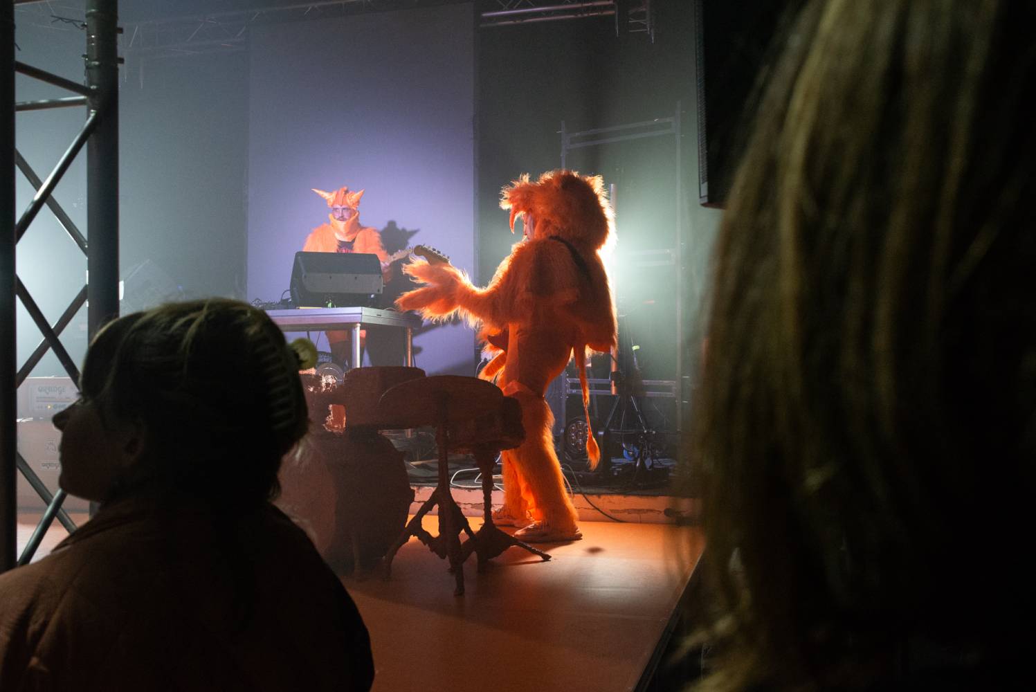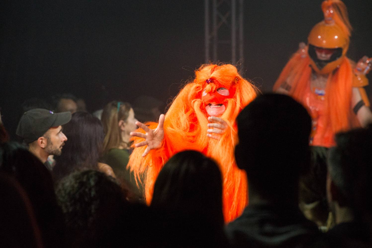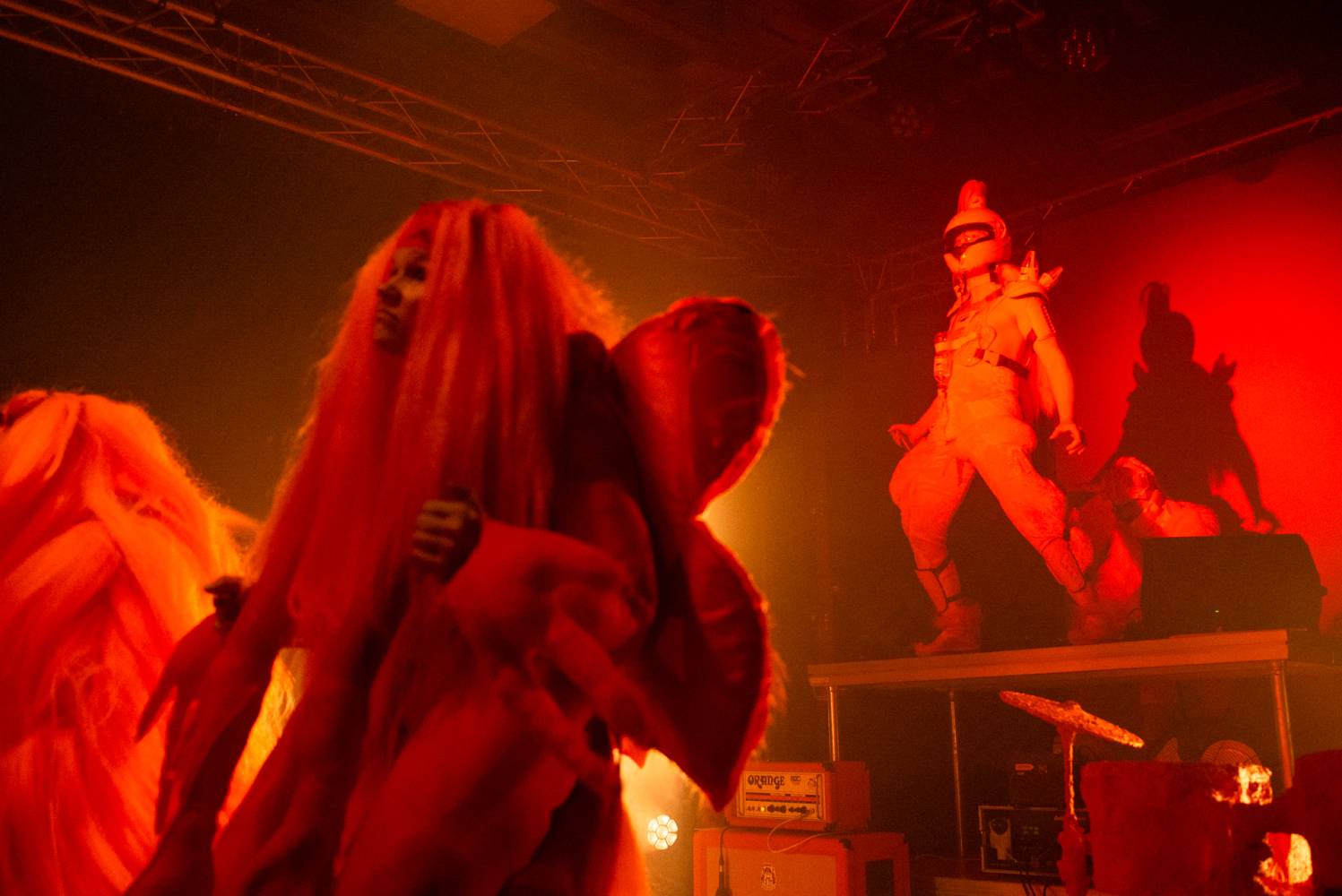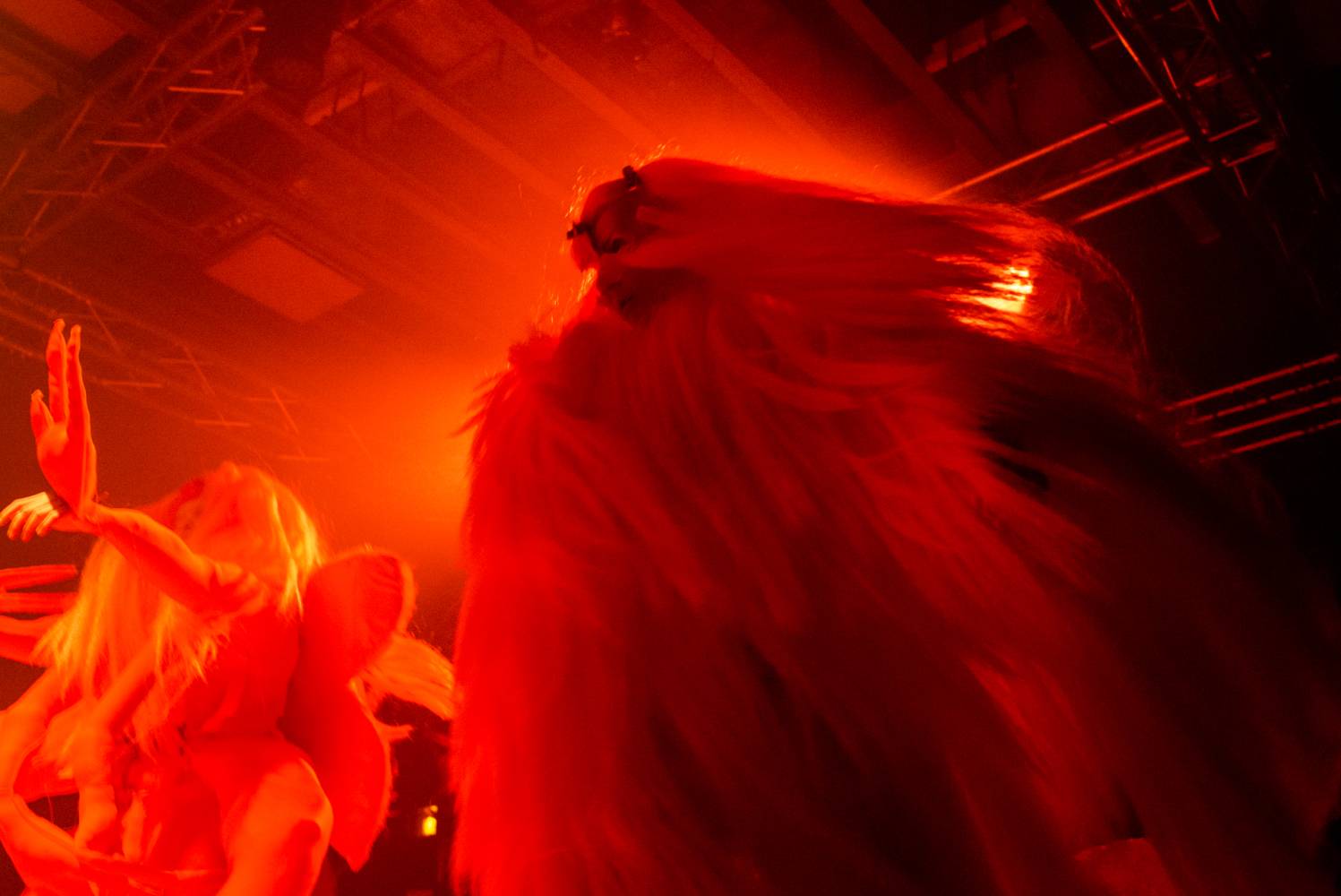 "We have created a stage performance with the love of musical worlds. Of their genres, sub-genres, and sub-sub-genres, of their cultures, aesthetics, icons, and fetishes. It's an intense physical performance by a five-member performance group somewhere between a concert, a party, a light show, and a dance choreography inspired by headbanging, a cyclical repetitive dance movement, often limited to the upper half of the body or only the cervical spine. Headbanging emerged from a fascination with the theatricality and fiction of music, artistic alter egos, stage identities, costumes, and set design. It was born from the amusement of transgressing the permissible in ordinary reality, obscenity, silly song lyrics, symbols, mythologies, pseudo-spirituals and primordial spiritualities, conspiracies, images of hyperviolence and hypersexism, and commercial countercultures. Headbanger was born from the joy of collectively experiencing concerts, atmospheres, and moments that make us physically react with our bodies. Situations in which we can be emotional, expressive, and spontaneous. Situations in which we can express ourselves without exposing ourselves to judgment. Headbanger is a performance that has gone