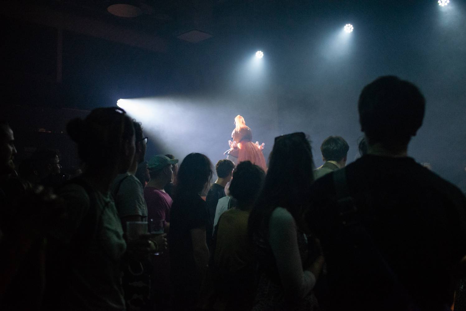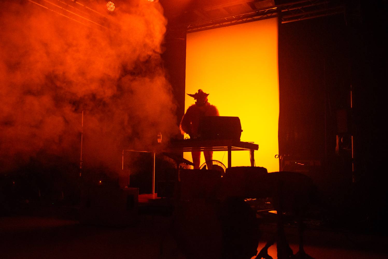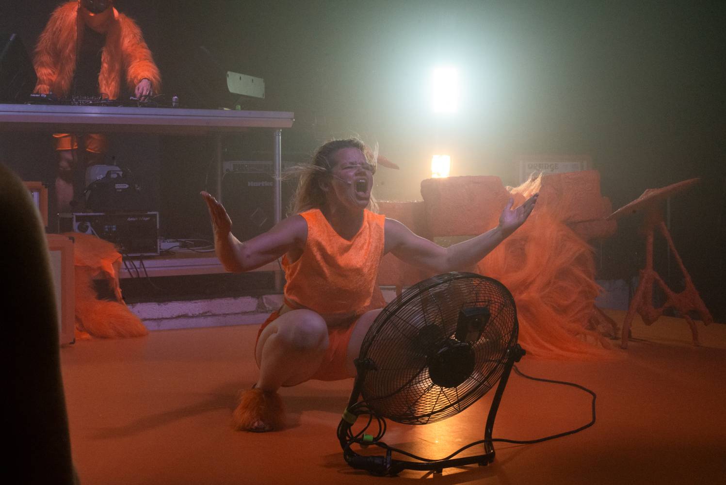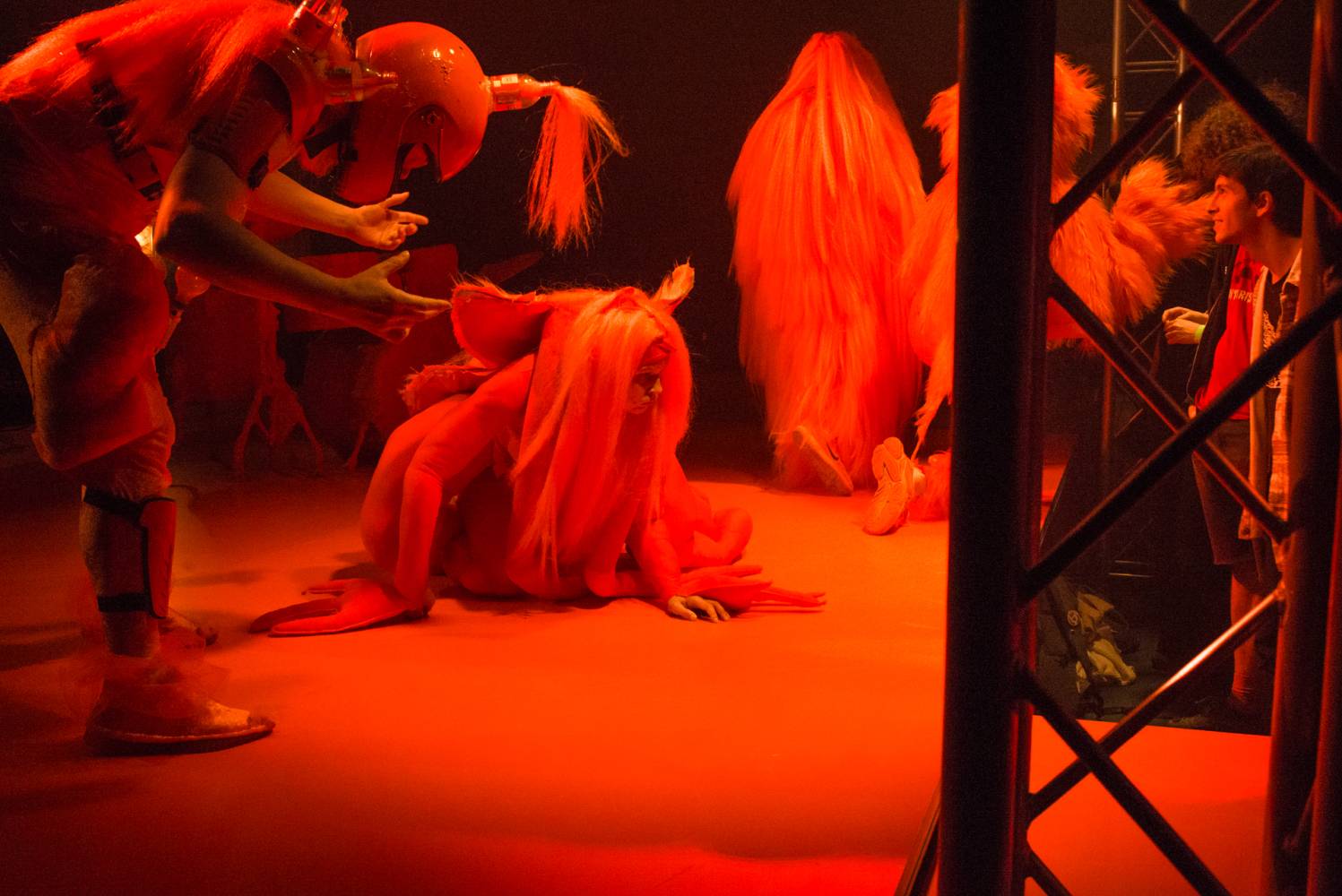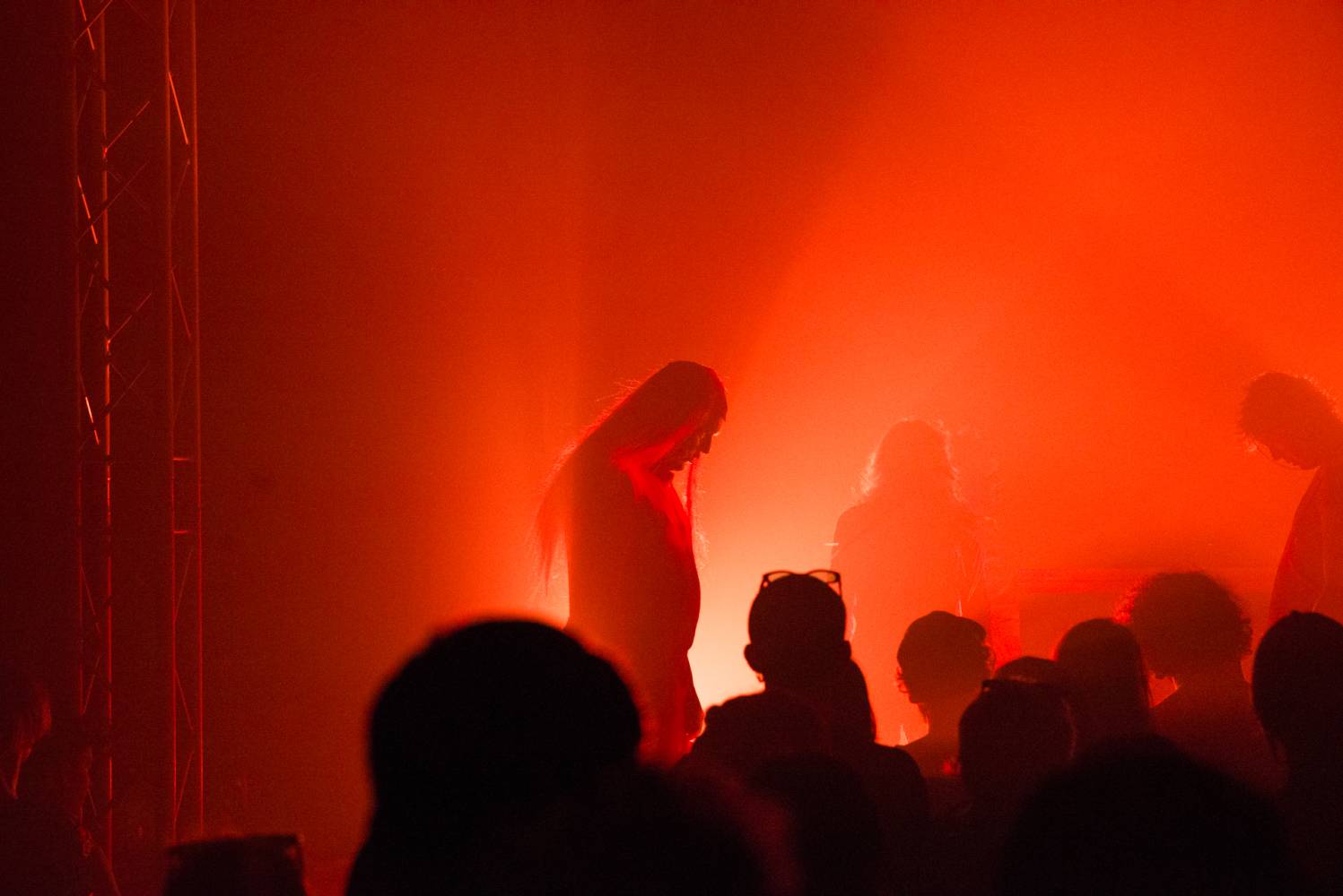 "We have created a stage performance with the love of musical worlds. Of their genres, sub-genres, and sub-sub-genres, of their cultures, aesthetics, icons, and fetishes. It's an intense physical performance by a five-member performance group somewhere between a concert, a party, a light show, and a dance choreography inspired by headbanging, a cyclical repetitive dance movement, often limited to the upper half of the body or only the cervical spine. Headbanging emerged from a fascination with the theatricality and fiction of music, artistic alter egos, stage identities, costumes, and set design. It was born from the amusement of transgressing the permissible in ordinary reality, obscenity, silly song lyrics, symbols, mythologies, pseudo-spirituals and primordial spiritualities, conspiracies, images of hyperviolence and hypersexism, and commercial countercultures. Headbanger was born from the joy of collectively experiencing concerts, atmospheres, and moments that make us physically react with our bodies. Situations in which we can be emotional, expressive, and spontaneous. Situations in which we can express ourselves without exposing ourselves to judgment. Headbanger is a performance that has gone