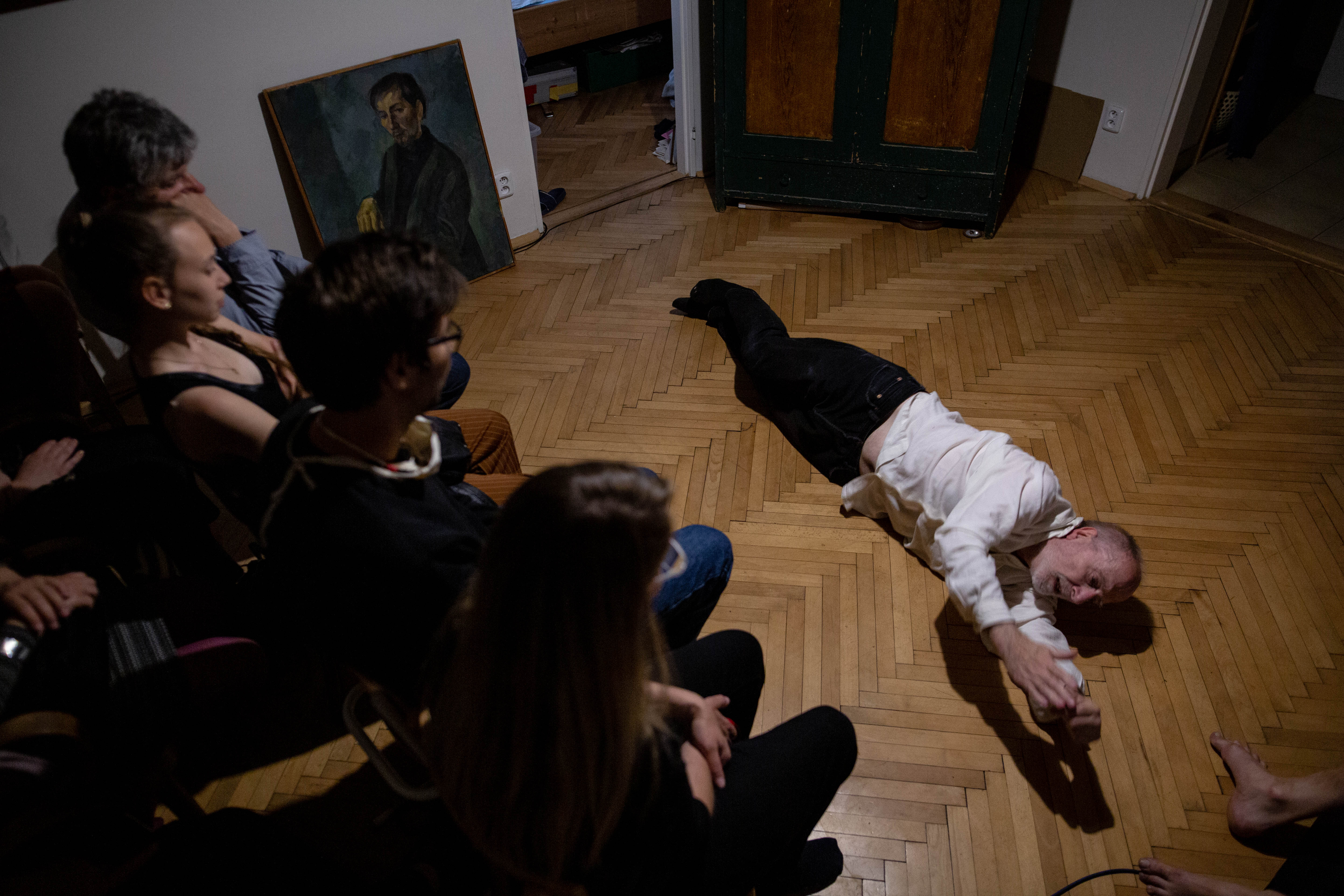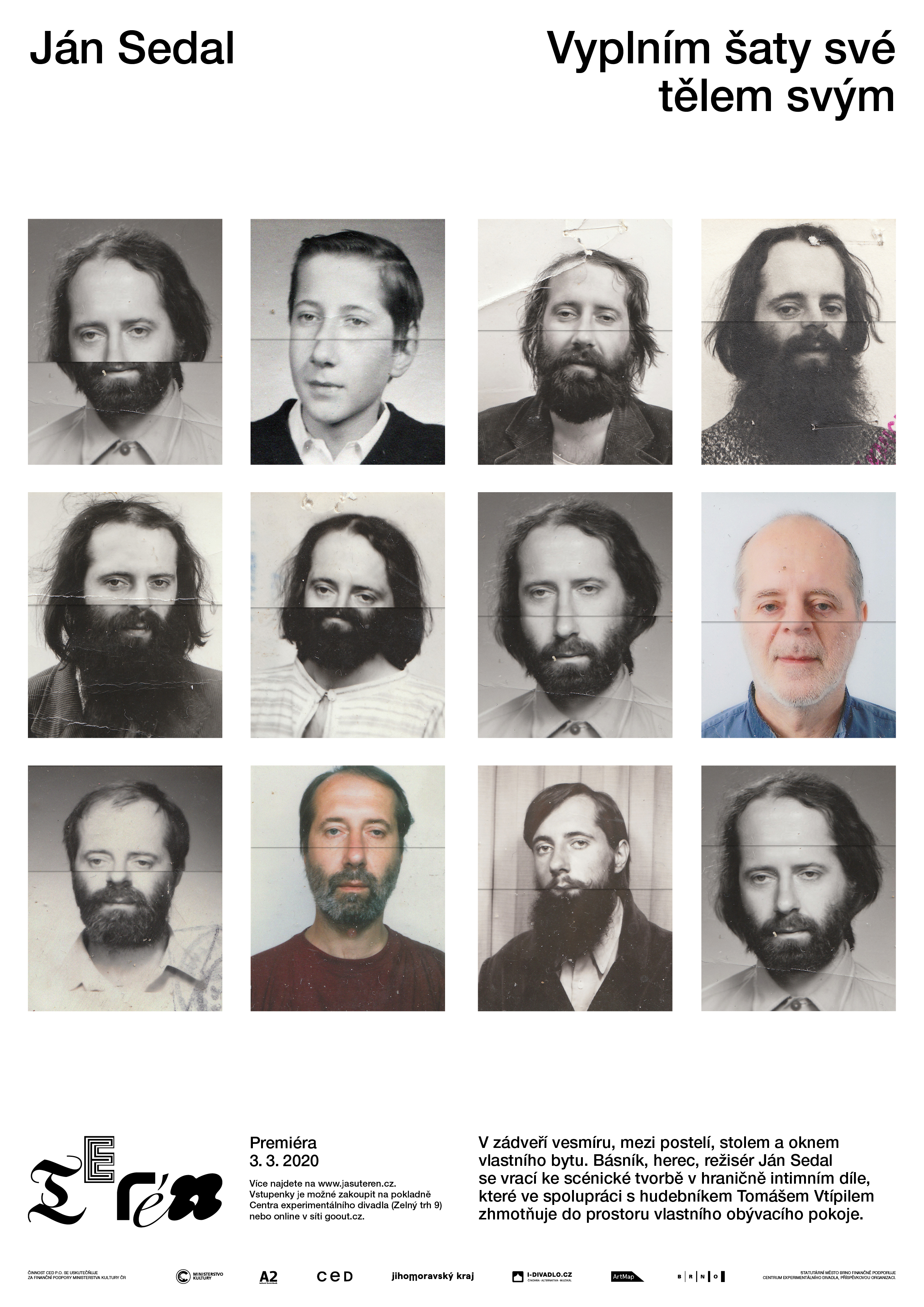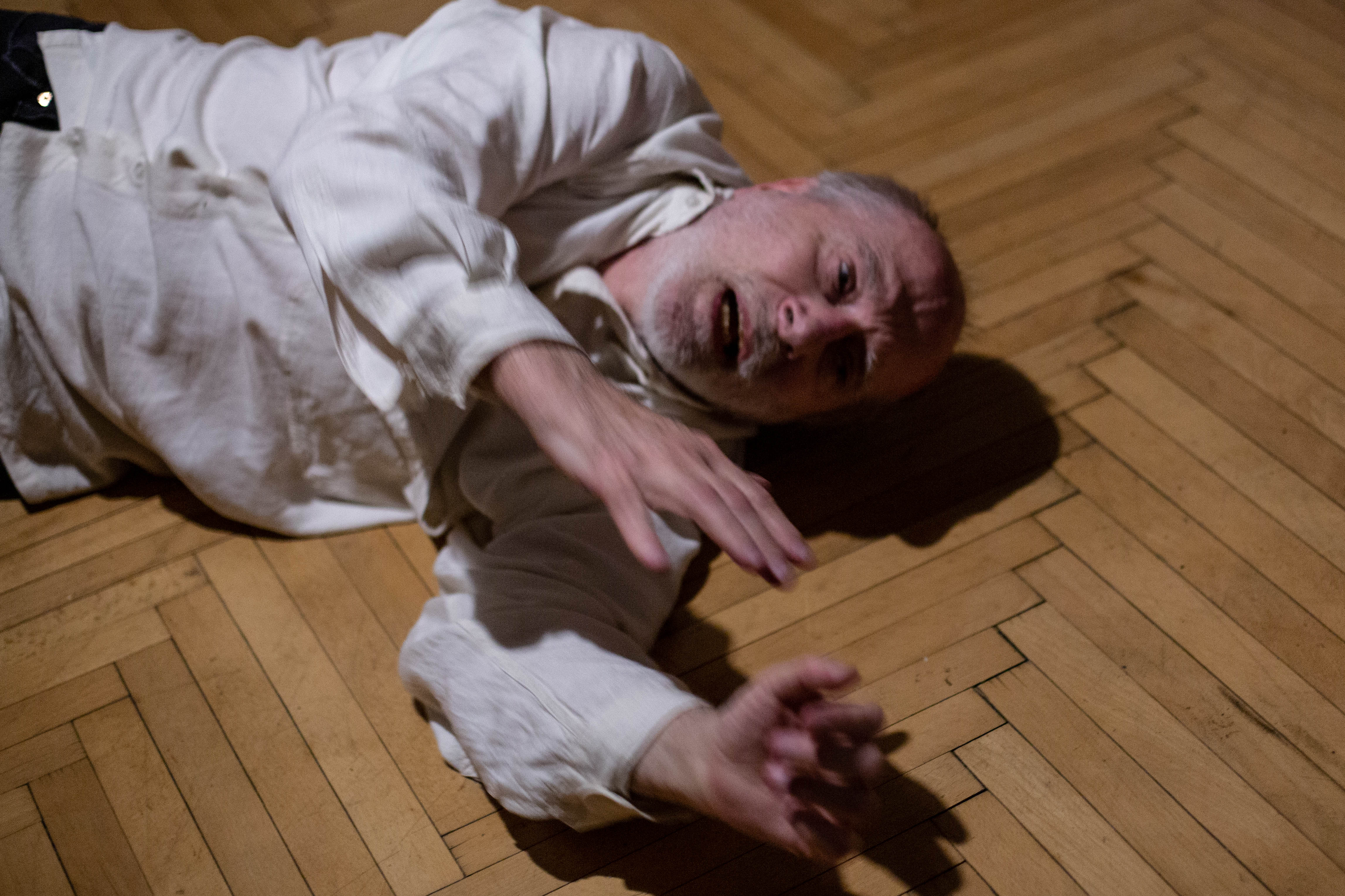 is true that in many ways, Ján is an unbridled and an irrepressible spirit. The director of Archa Theatre Ondřej Hráb fondly calls him a “rascal”, meaning a stubborn anarchist. Ján Sedal, however, often shows a surprising tenacity and discipline. In the past two years, Ján Sedal had to deal with the consequences of a severe injury forcing him to re-learn basic everyday activities. Despite that, in the solitude of his apartment and with minimal support, he decided to lay down his immense and almost surrealistically disjointed imagination on the floor of a small room, and create a strongly personal production. In that way, somewhere between the bed, the window and the wardrobes, he forms a genuine Czechoslovakian butoh. It differs from its Japanese precursor in its higher degree of a deep-rooted shabbiness, absurdity, and humor which could not exist anywhere else outside the Middle-European context (that is somewhere in the middle of baroque, symbolists, cimbalom music, Hašek, Kafka, Deml, surrealists, The Plastic People of the Universe, DG 307, Dežo Ursiny, and Marián Varga). Sedal’s butoh could be considered a dance emphasizing every gram of the body, every wrinkle, and the magical strength of concentration chiselled by years of practice and perfecting. His world is, however, much wider. In a singular, short segment of time, Jáno undoubtedly demonstrates all he can do. He veers from dance to ritual, drama, and even a fierce battle with his own body. He ceases to control the little, and out of the little he makes a lot. He raises modest chaos, and with little gestures he builds and tears off loads of invisible curtains. He chose musician Tomáš Vtípil as a kindred spirit and companion.