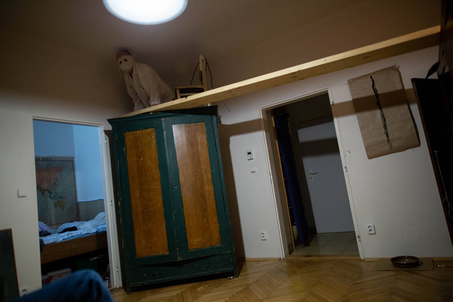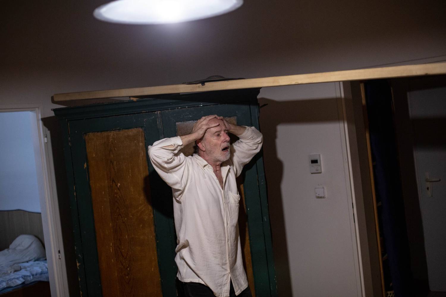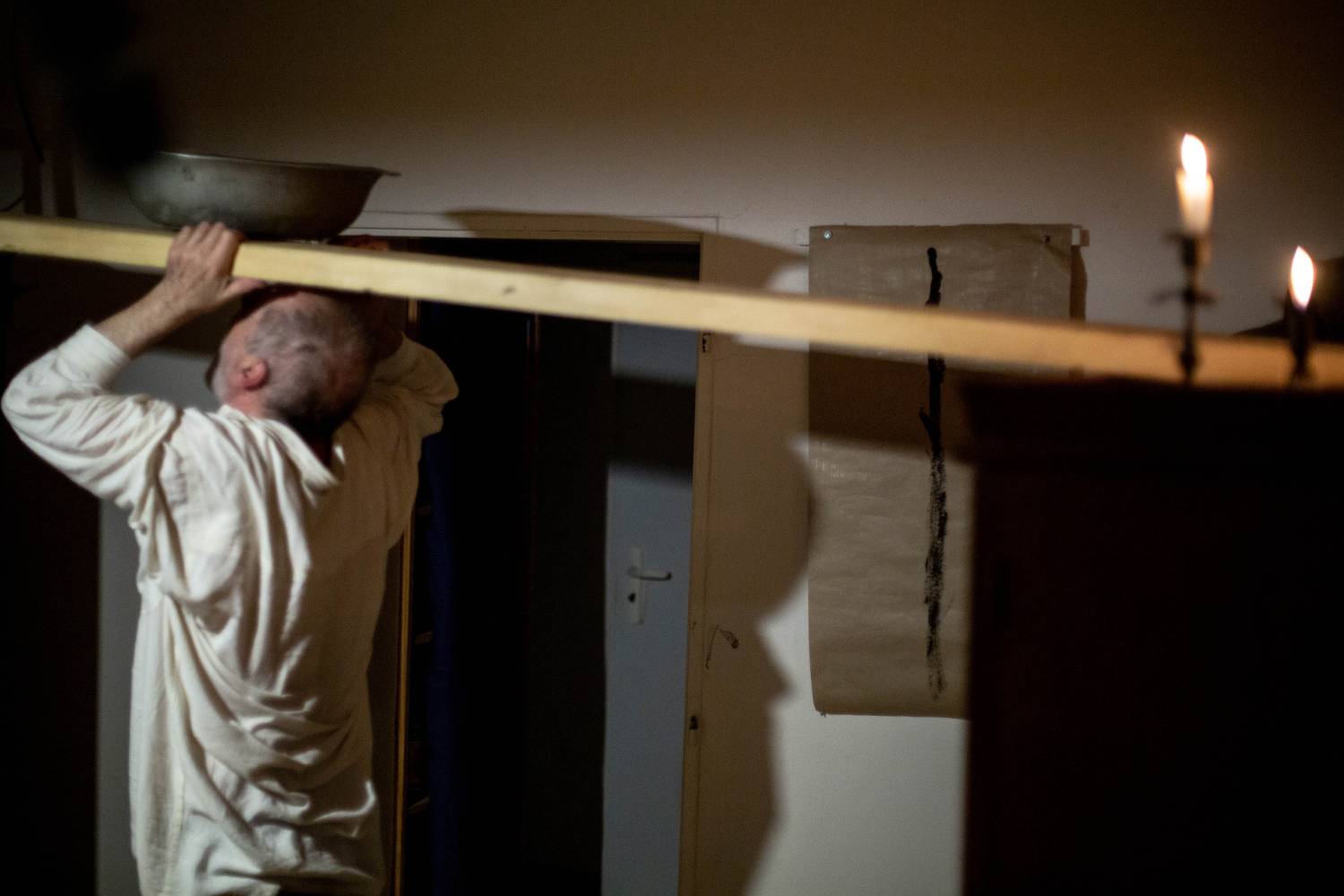 is true that in many ways, Ján is an unbridled and an irrepressible spirit. The director of Archa Theatre Ondřej Hráb fondly calls him a “rascal”, meaning a stubborn anarchist. Ján Sedal, however, often shows a surprising tenacity and discipline. In the past two years, Ján Sedal had to deal with the consequences of a severe injury forcing him to re-learn basic everyday activities. Despite that, in the solitude of his apartment and with minimal support, he decided to lay down his immense and almost surrealistically disjointed imagination on the floor of a small room, and create a strongly personal production. In that way, somewhere between the bed, the window and the wardrobes, he forms a genuine Czechoslovakian butoh. It differs from its Japanese precursor in its higher degree of a deep-rooted shabbiness, absurdity, and humor which could not exist anywhere else outside the Middle-European context (that is somewhere in the middle of baroque, symbolists, cimbalom music, Hašek, Kafka, Deml, surrealists, The Plastic People of the Universe, DG 307, Dežo Ursiny, and Marián Varga). Sedal’s butoh could be considered a dance emphasizing every gram of the body, every wrinkle, and the magical strength of concentration chiselled by years of practice and perfecting. His world is, however, much wider. In a singular, short segment of time, Jáno undoubtedly demonstrates all he can do. He veers from dance to ritual, drama, and even a fierce battle with his own body. He ceases to control the little, and out of the little he makes a lot. He raises modest chaos, and with little gestures he builds and tears off loads of invisible curtains. He chose musician Tomáš Vtípil as a kindred spirit and companion.
