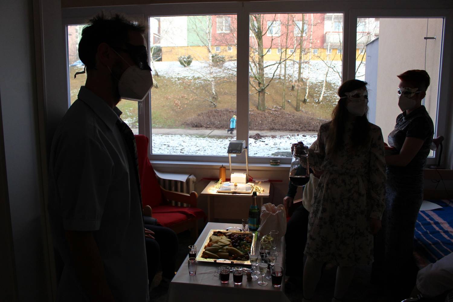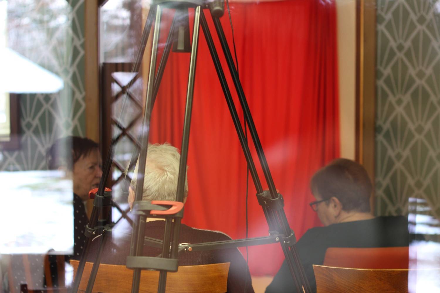 After all this preparation, it was clear we’ll have to dress up for the occasion. Markéta and I both wore a dress we’d never worn before. Pavla and Markéta accidentally matched with their velvet outfits. A perfect harmony. On the day of the premiere, a gentle clink sound was heard among the noises of the demolition works. One of the clients asked: “Does it start already?”. First, a creaky light brown leather sliding door opened, behind it there was a red curtain and behind the curtain there was our new door which shined for its 15 minutes of fame, joy, and love. We, on the other hand, had our 15 minutes of full concentration, a state of mind similar to trance. Markéta played the kantele and then she read her poem. Pavla played after that and Markéta read the story of Baucis and Philemon. Honza and I were immersed in the shadow play and at the end of the performance we opened the door. This sequential opening of the doors and the curtain was crucial in the performance. At the beginning, it seemed that our performance was mainly aimed at the clients but then it became clearer and clearer that it was also an initiation ceremony for the new door. Finally, there was a magical sound of the wooden koshi wind chimes, the painting on paper was torn down and the new illuminated doorway to the lounge room was revealed. The whole space was flooded with light. Behind the doorway there were people beckoning us to step over the doorsill and celebrate the birth of the door. One of the clients wondered: “Is it the end already?”