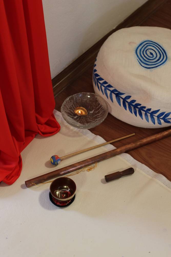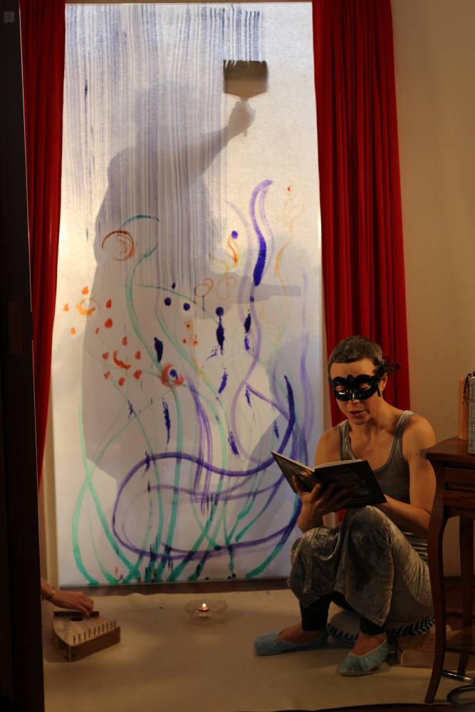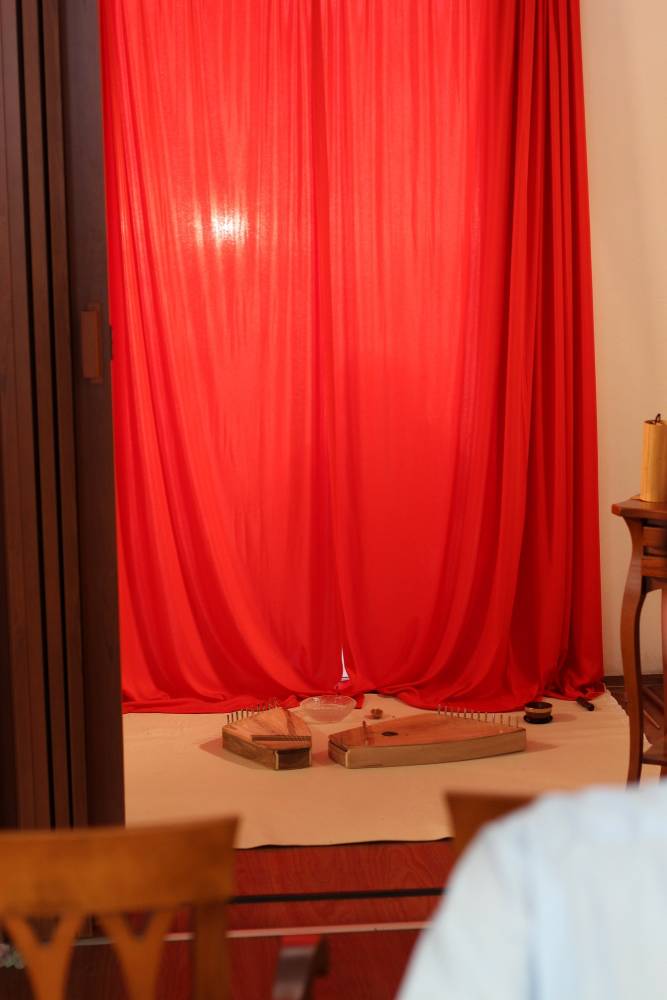 Anyone can perform this ceremony anywhere anytime. It is primarily designated for social and health services, art schools, and social facilities. It takes approximately 15 minutes and should be ideally performed by four people. The first pair play the instruments and read the poem and the story, the second pair do the painting and the shadow play in connection with the reading depending on the available materials and technology. The performance focuses on slow movements and calm, pleasant atmosphere. It is a ceremony to welcome a door, celebrate its revealing and opening. It doesn’t matter whether the door is new or old. The important thing is to perceive something ordinary as a festive event. The ritual is also suitable for outdoor gates. It can be performed outside or inside, day or night. Finally, we recommend you to prepare some refreshments and spend some time celebrating. The door and you play the main role.