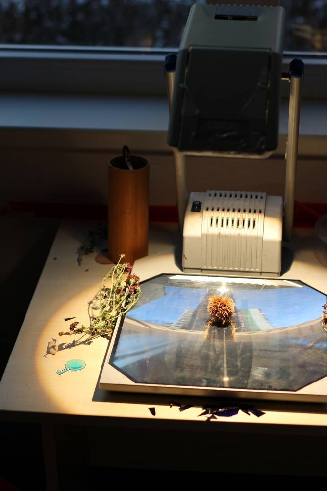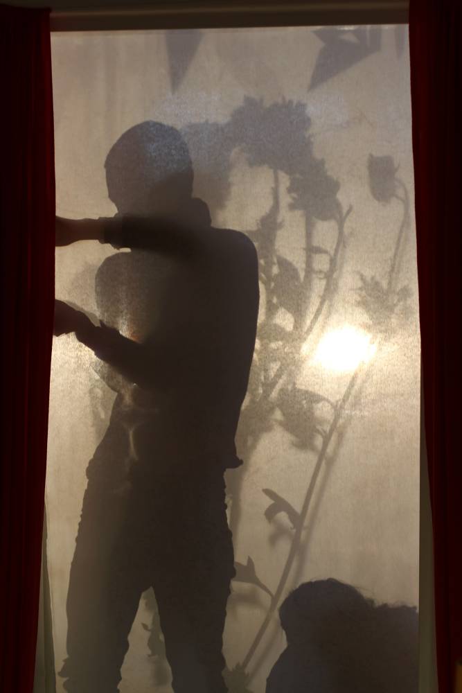 We thought we could use the space of the door for a shadow play and painting. We divided the roles as such – Honza and I would do the shadow play, Markéta would do the music and reading. Honza also suggested his colleague Pavla Maslejová who plays in a band. She agreed. And so there were four of us and we started working on the dramaturgy. We tested the stage design a couple of times. Finally, we decided to go with painting on a padding material and a shadow play through a meotar. For props, we decided to use colourful filters, a magnifying glass, and flowers depicting a tree of happiness. We were looking forward to improvising together and we were curious about the reactions of the clients and the personnel who were mainly happy about the new door. We can’t exactly say what the new door was looking forward to. On the eve of the performance, Markéta even unexpectedly wrote a new, slightly Shakespearean poem. The only thing missing now was a red curtain. I asked Beáta Spáčilová, an artist and a founder of Brno šije platform, to sew it for us.