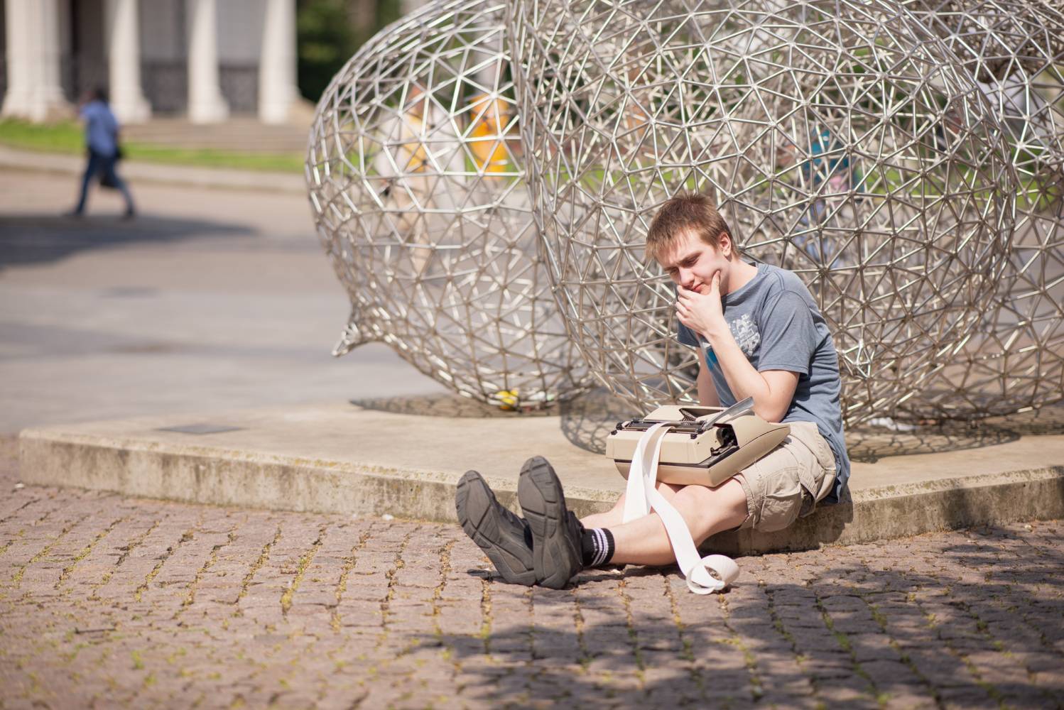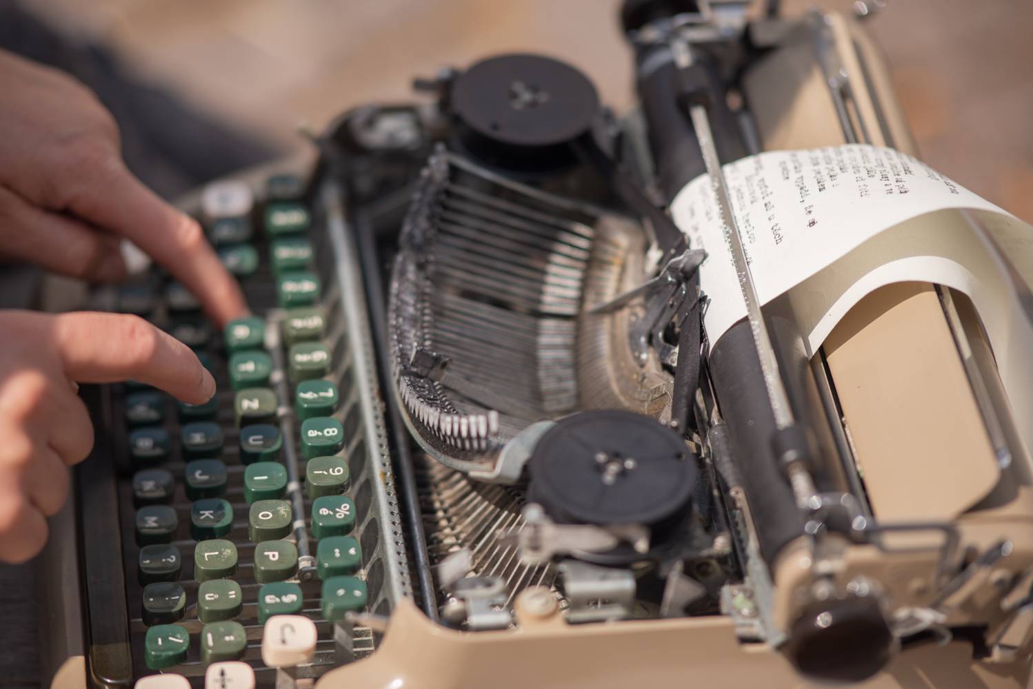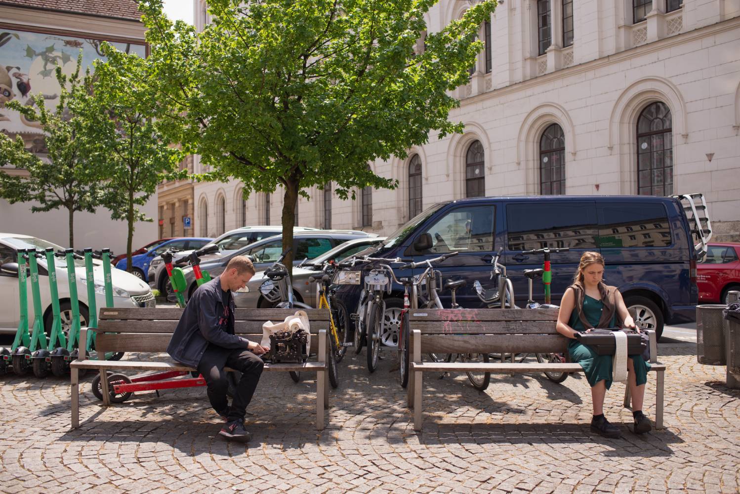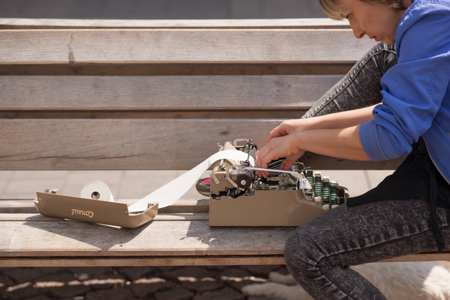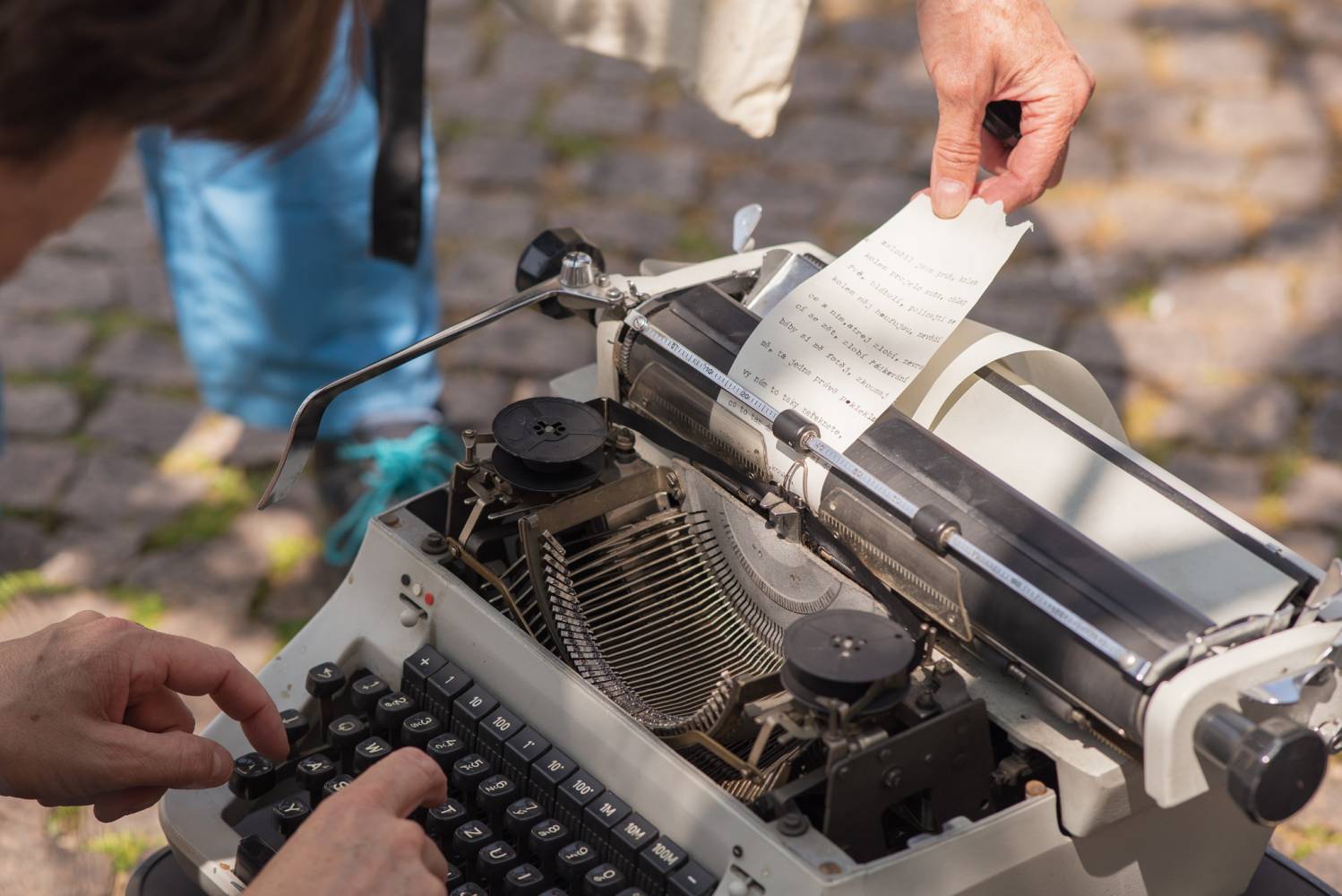 The performance explores the written recording of events and processes in real time. It assumes that the type of recording medium largely defines the outcome: typing on a computer differs structurally and sensorially from handwriting, and the dynamics of a typewriter are equally unique. In this sense, the creative act focuses on the typewriter—its noisiness, mechanical nature, rhythm, and almost musical quality. The textual record thus becomes an imprint of the connection between the human brain and fingers with machine mechanics, ink ribbon, and paper. Writing on the typewriter will also represent a live action in the urban space.