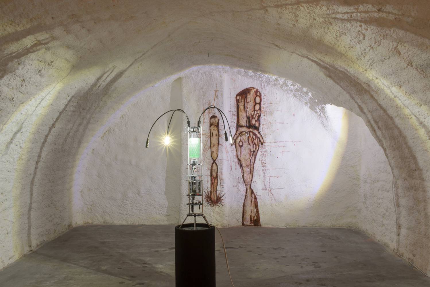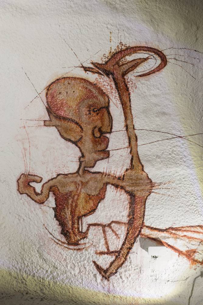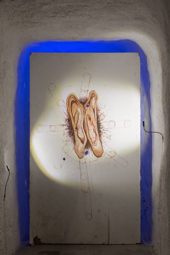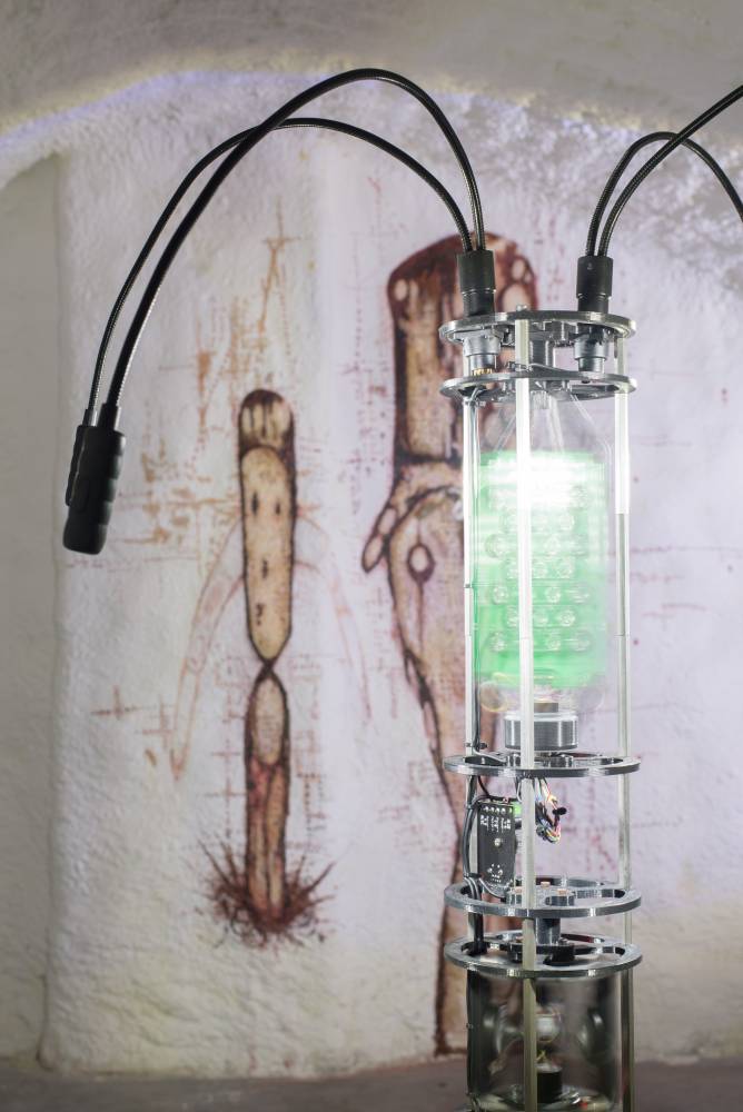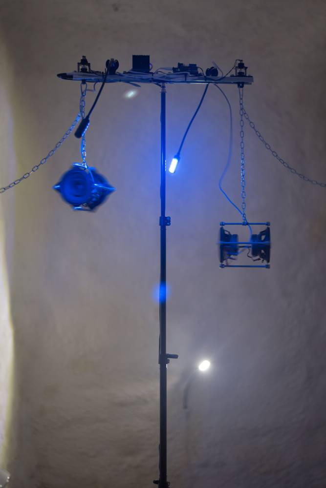 The first of the three exhibition blocks of the Order of Sonic Chaos project, called Preliminary Shrine, combines sound objects and visual art into a unique installation in the catacombs. The exhibited ritual sound instruments and objects use the principle of psychoacoustic effects, ultrasound, and controlled rotation. They are based on the artistic practice of the eponymous collective Order of Sonic Chaos, which has used some of these objects in sound ceremonies since 2015. The visual artists František Hanousek and Jakub Hájek were invited to collaborate, and on this occasion, they work with the motifs of parafiction, pain, and resonance of body organs. Sound artist and composer Natálie Pleváková was invited to use the installation as an instrument interface for the concert situation.