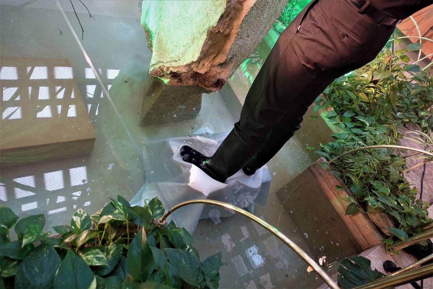 Když pohlédneme na mapě trošku nalevo a kousek níž, tak pod hradem Špilberkem by mohlo být či bít srdce Brna. Právě tam na Šilingrově náměstí, dříve Sviňském trhu, byl v druhé polovině devatenáctého století postaven první nájemní dům v Brně. Dnes je z něj luxusní hotel a v jeho novorenesančních arkádách se odrážejí odlesky skutečných i potencionálních hostů. Vždyť nedaleko bydleli bratři Haasové i Ernst Wiesner a pár let před nimi zde své objevy obhajoval Johan Gregor Mendel. Kompozice Herzmerz Michala Wroblewského se v proskleném atriu hotelu Barceló Palace Brno rozléhá, jakoby do něj patřila od nepaměti a pořád a znovu evokuje nečekané odlesky a tváře hostů, pracujících na svých služebních cestách.