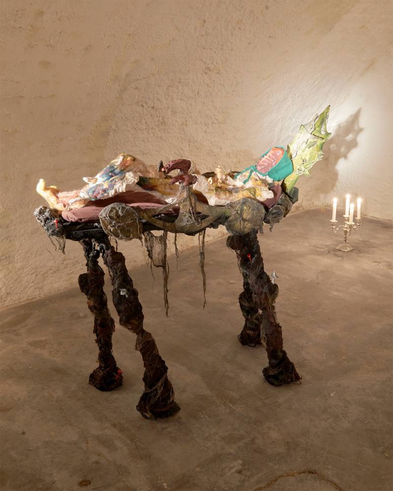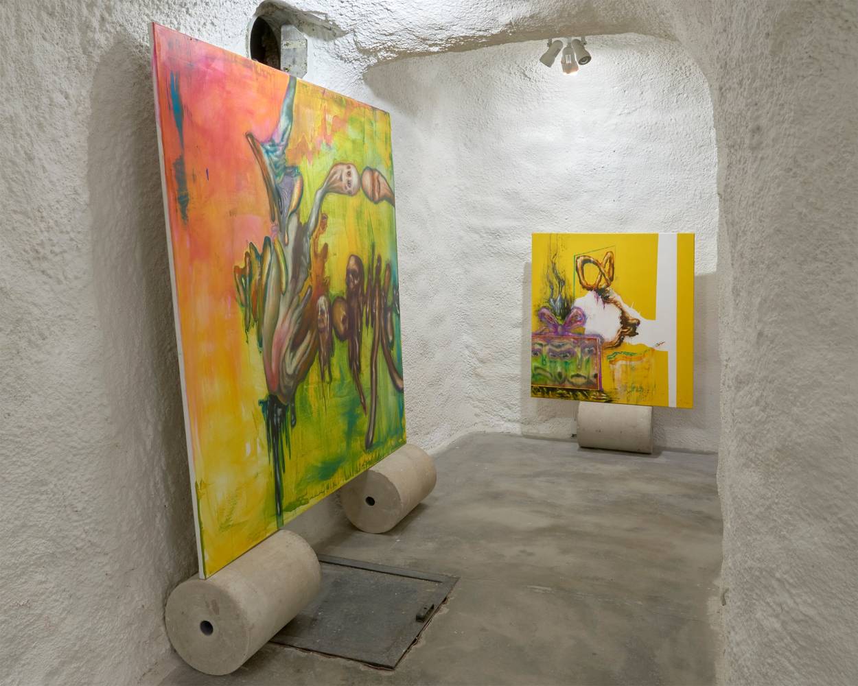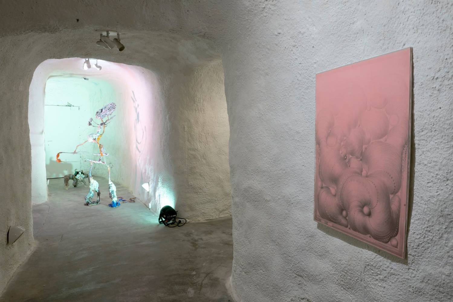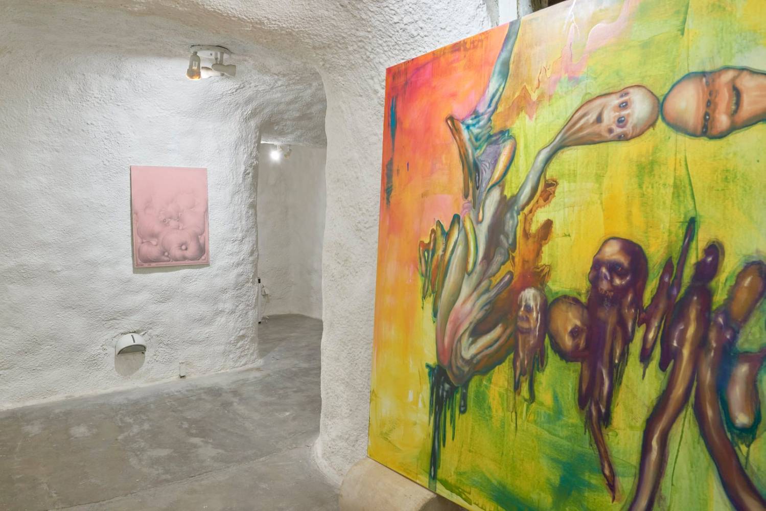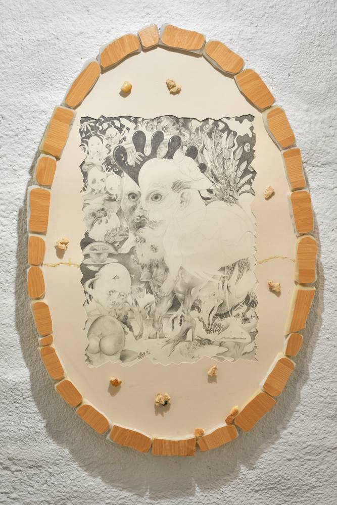 In her paintings, Kinke Kooi creates diagrams of these processes that immerse the viewers in an imaginative space of transpersonal levelling – a space that is confronted by the gorish explicitness of Csaba Kis-Róka. These two-dimensional works break on the concave rooms and carve out a tunnel where the sculptural invocations of Chin Tsao dialogue with the mystic characters of Marek Delong and Anna Slama. In between, you will find Kea Bolenz´s fine-line works that encapsulate entities in the act of transgressing these dimensions.
