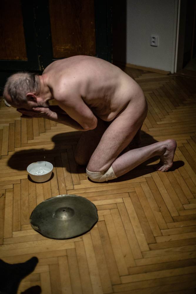 true that in many ways, Ján is an unbridled and an irrepressible spirit. The director of Archa Theatre Ondřej Hráb fondly calls him a “rascal”, meaning a stubborn anarchist. Ján Sedal, however, often shows a surprising tenacity and discipline. In the past two years, Ján Sedal had to deal with the consequences of a severe injury forcing him to re-learn basic everyday activities. Despite that, in the solitude of his apartment and with minimal support, he decided to lay down his immense and almost surrealistically disjointed imagination on the floor of a small room, and create a strongly personal production. In that way, somewhere between the bed, the window and the wardrobes, he forms a genuine Czechoslovakian butoh. It differs from its Japanese precursor in its higher degree of a deep-rooted shabbiness, absurdity, and humor which could not exist anywhere else outside the Middle-European context (that is somewhere in the middle of baroque, symbolists, cimbalom music, Hašek, Kafka, Deml, surrealists, The Plastic People of the Universe, DG 307, Dežo Ursiny, and Marián Varga). Sedal’s butoh could be considered a dance emphasizing every gram of the body, every wrinkle, and the magical strength of concentration chiselled by years of practice and perfecting. His world is, however, much wider. In a singular, short segment of time, Jáno undoubtedly demonstrates all he can do. He veers from dance to ritual, drama, and even a fierce battle with his own body. He ceases to control the little, and out of the little he makes a lot. He raises modest chaos, and with little gestures he builds and tears off loads of invisible curtains. He chose musician Tomáš Vtípil as a kindred spirit and companion.