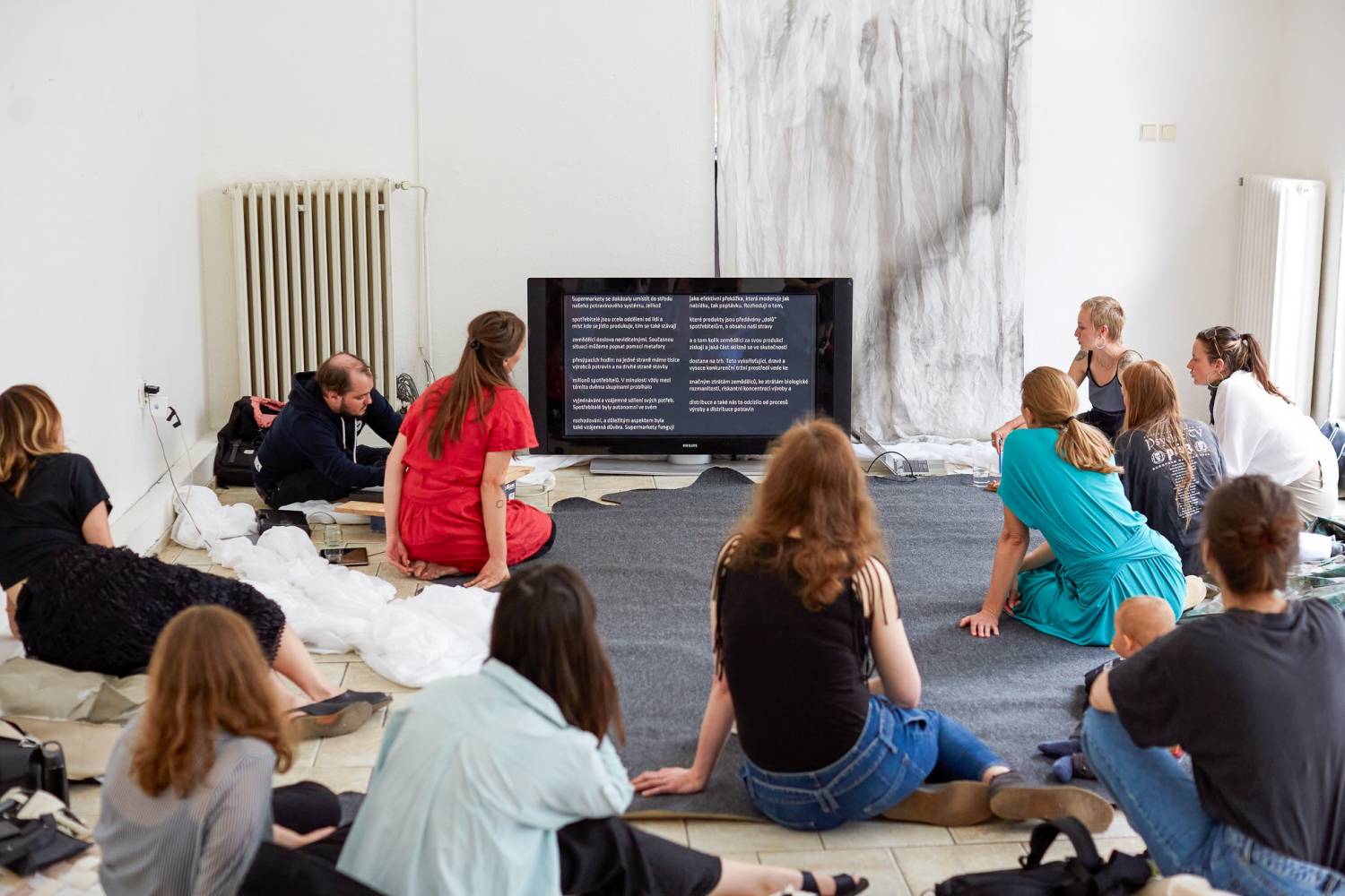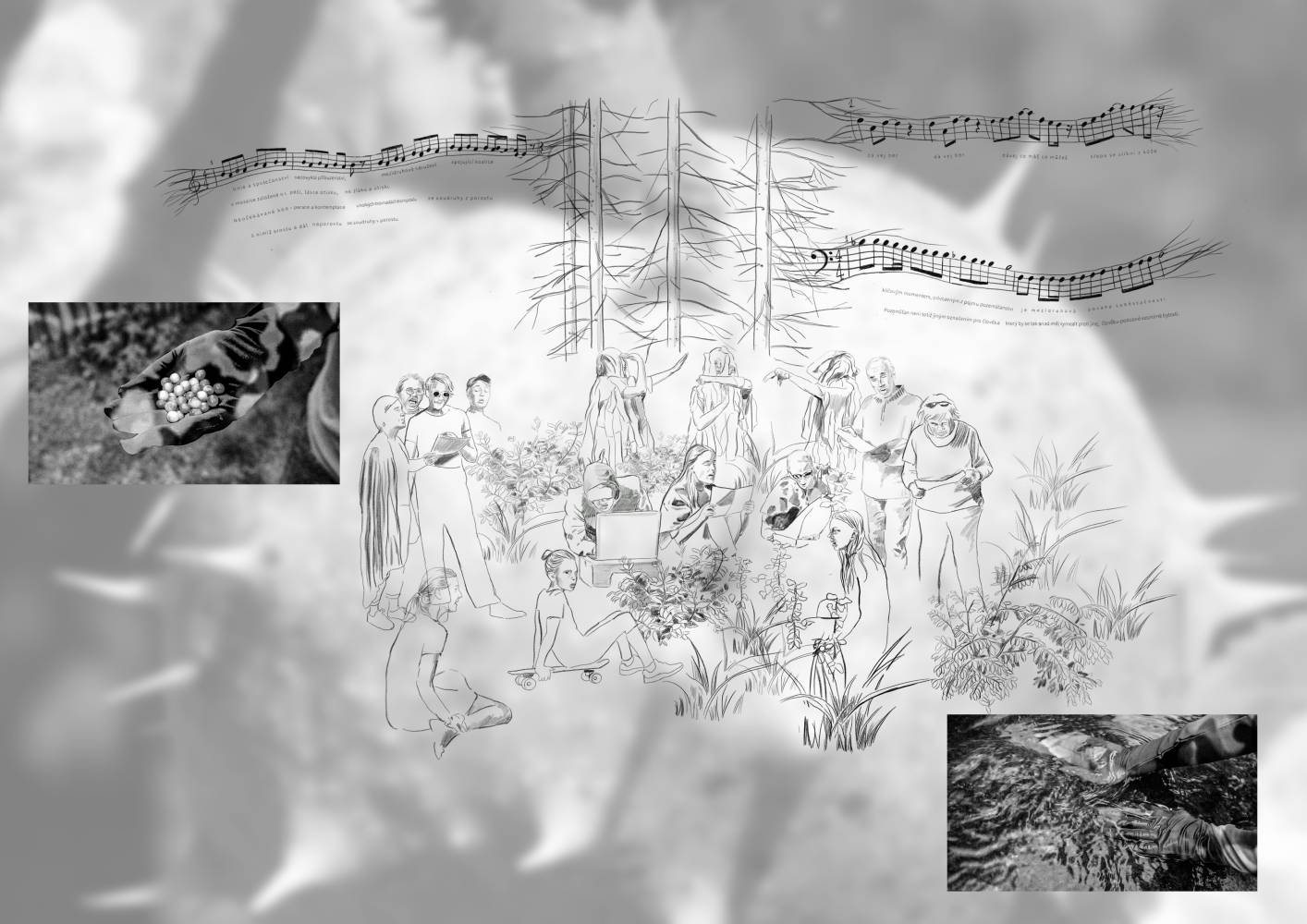 Denisa Langrová, Ruta Putramentaite, and Jonáš Richter, in their performance project Sbor Družstva život (Choir of the Life Cooperative), work with the emotional charge of collective singing and its ability to create shared space. Through choral singing, they let their bodies resonate with the frequencies of emancipatory theory and poetry. They incorporate fragments of academic texts as well as folk and pop songs, which they recontextualize into a mosaic of potential pathways out of today’s crises. Thematically, the texts align with ecofeminism and respond to the specific context of each event in which the performance takes place. The songs are designed to be easily joined in by listeners. The Choir of the Life Cooperative studio album is available on Bandcamp.