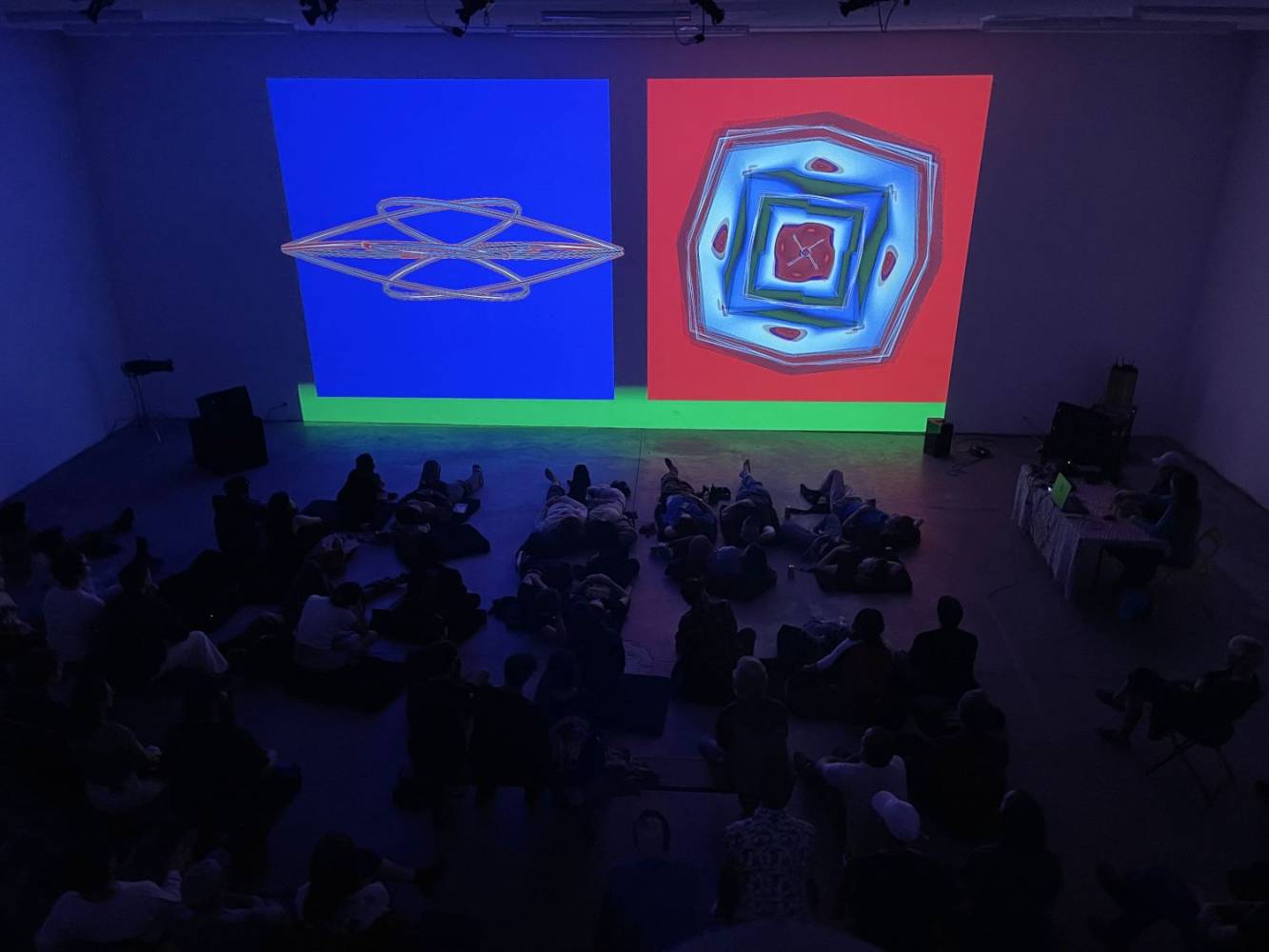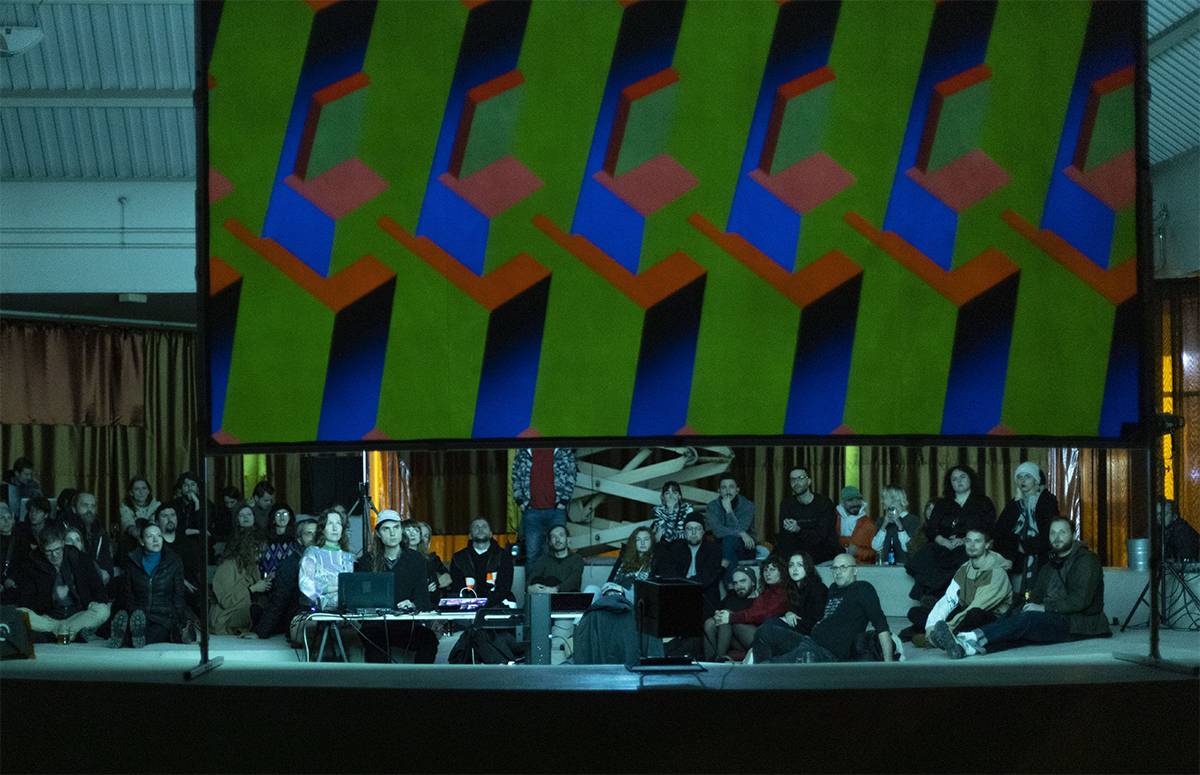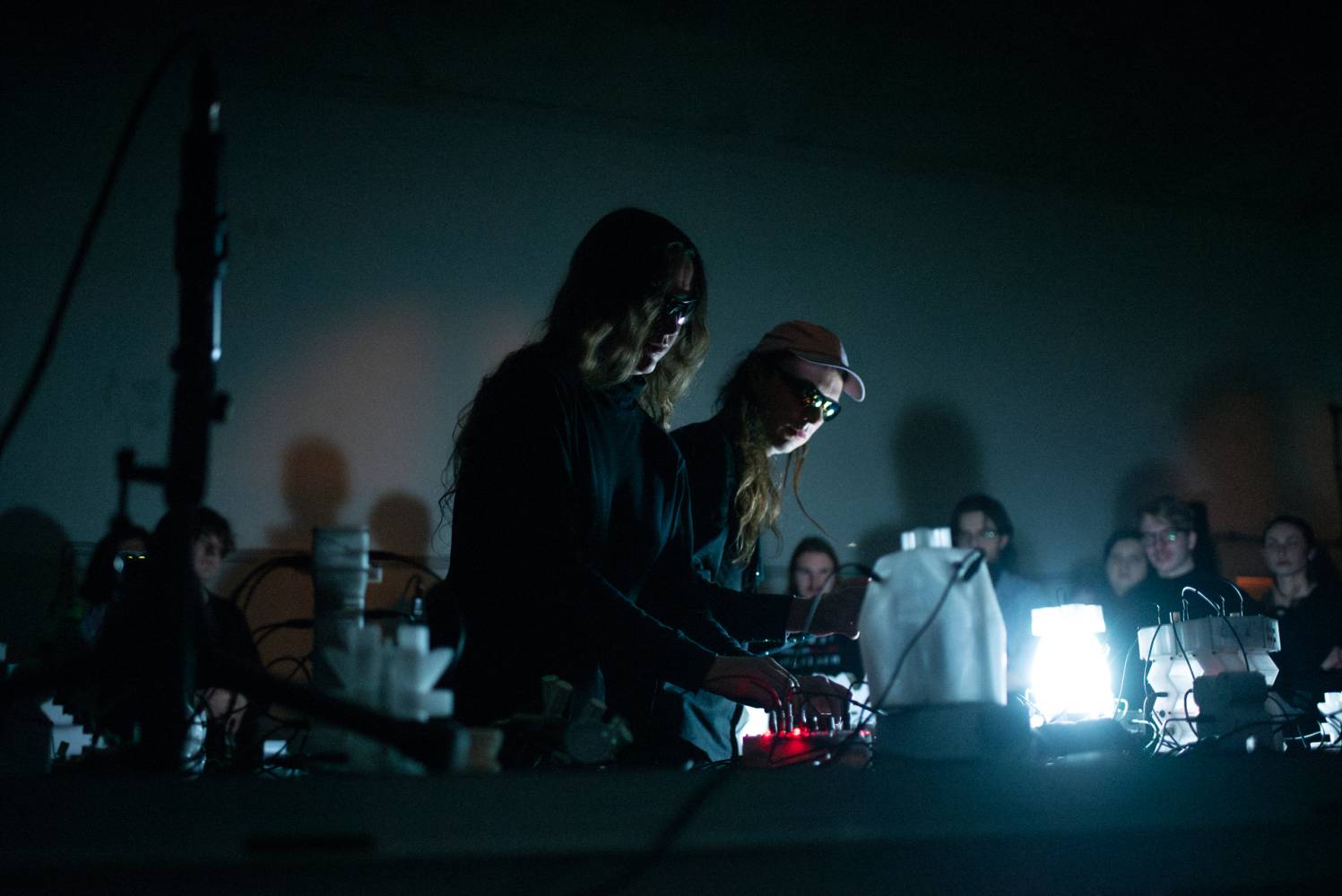 For this audiovisual performance, MSHR designed a digital system that links visual and sonic parameters using open-source software. The duo improvises with the system through a handcrafted sculptural interface—a tool that arranges signals into compositions of video projection and four-channel sound. The result is a form of live cinema in which visual and sonic shapes continuously evolve through the mutual interaction of the performers.
