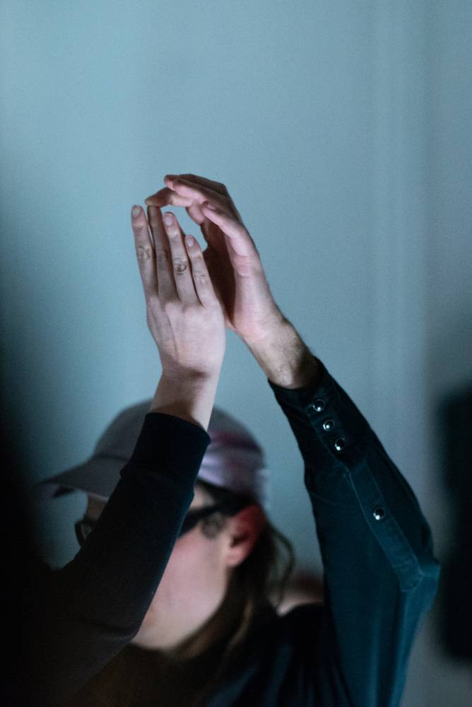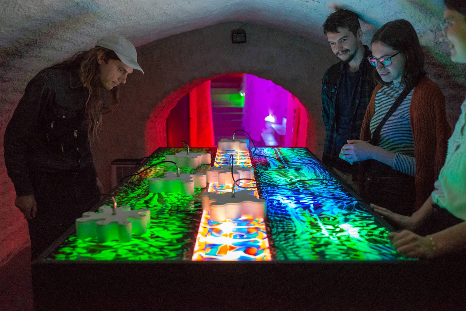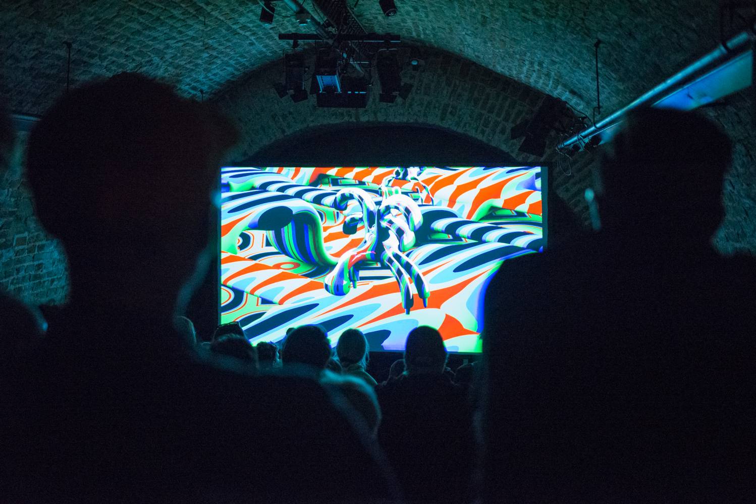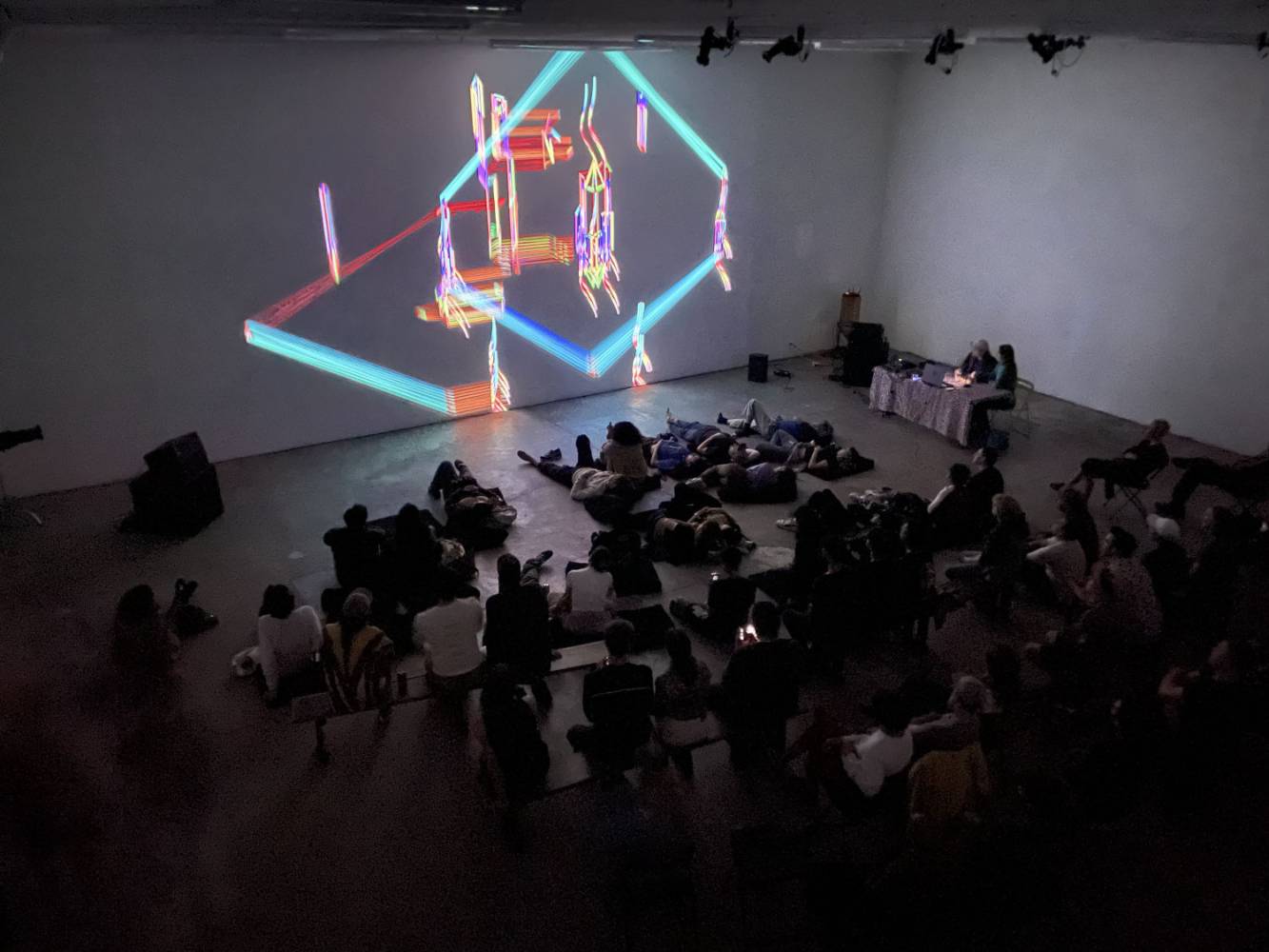 For this audiovisual performance, MSHR designed a digital system that links visual and sonic parameters using open-source software. The duo improvises with the system through a handcrafted sculptural interface—a tool that arranges signals into compositions of video projection and four-channel sound. The result is a form of live cinema in which visual and sonic shapes continuously evolve through the mutual interaction of the performers.