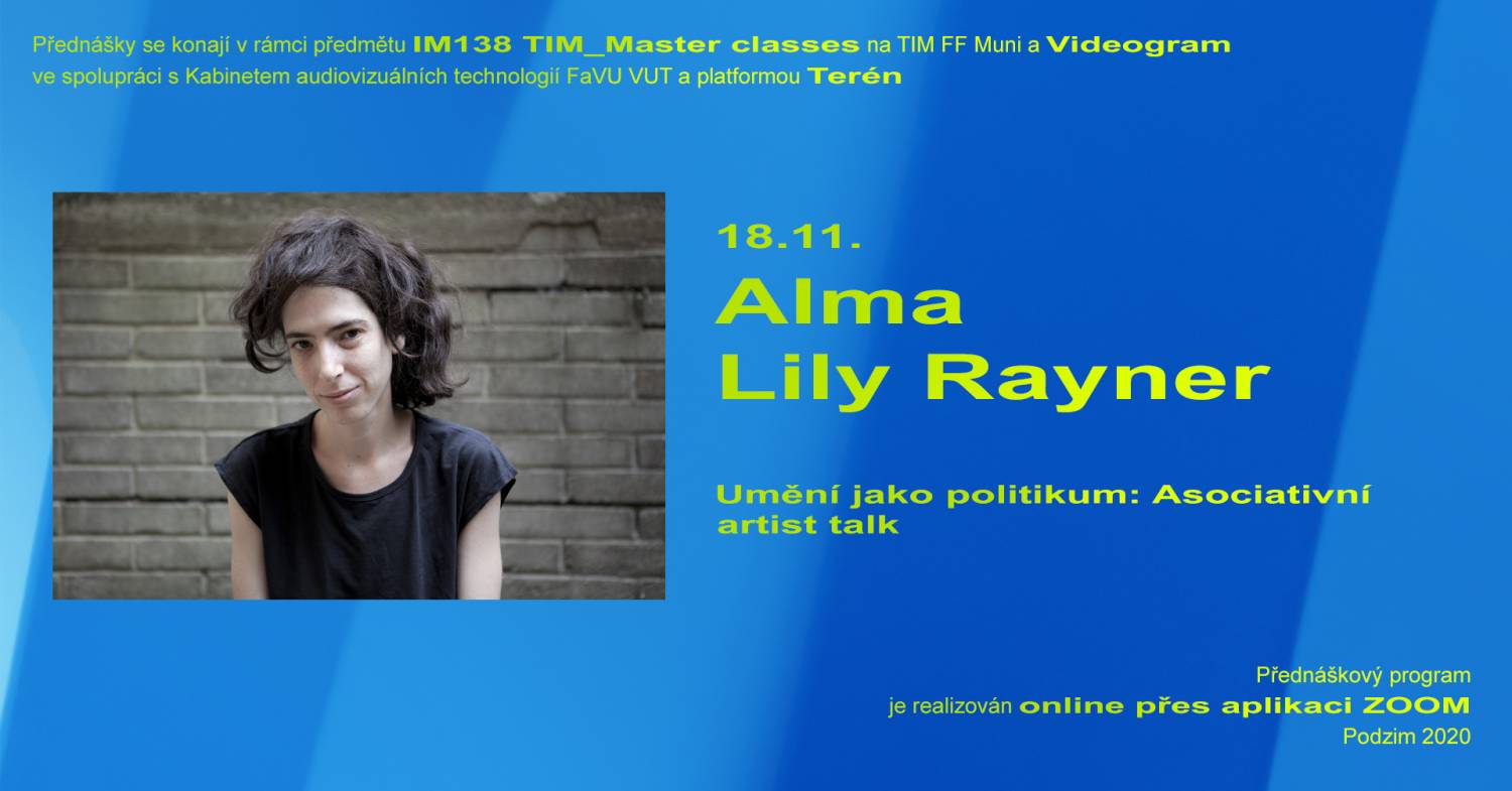 Anotace: Alma Lily Rayner je původem izraelská multidisciplinární umělkyně a aktivistka momentálně žijící a působící v Praze. Její tvorba se zaměřuje na sociopolitické témata, která propojuje s otázkami genderu, traumatu a neviditelných forem násilí. Přestože jsou její projekty velmi osobní, jsou svázány s dlouhodobým výzkumem, s cílem zpochybnit dominantní mocenské systémy. Pracuje napříč digitálními cmédii a se zbytkovým audiovizuálním materiálem, textem a mluveným slovem. Díla Almy Lily Rayner jsou obvykle doprovázena sérií společných setkání a diskusí. Její tvorba, která často přesahuje do veřejného prostředí, byla představena v Praze, Berlíně, Paříži, Jeruzalémě nebo v Benátkách. Je spoluzakladatelka spolku Barvolam. Textem o kultuře znásilnění přispěla do letošní edice Bez súhlasu.txt, publikace z dílny Apart, Kapitál a Display. Je finalistkou Ceny Jindřicha Chalupeckého za rok 2020.