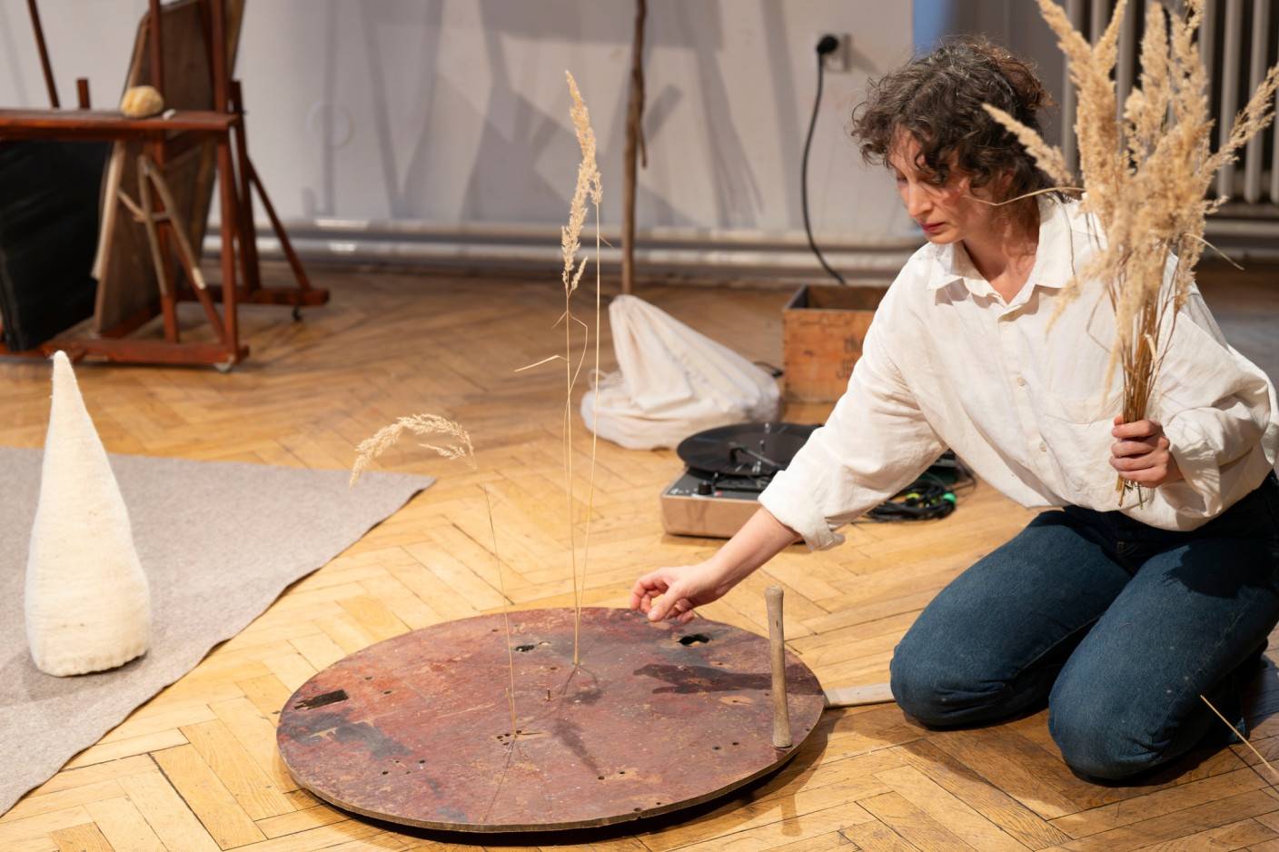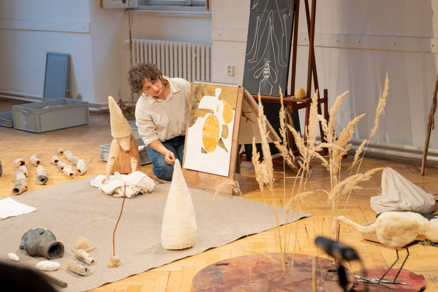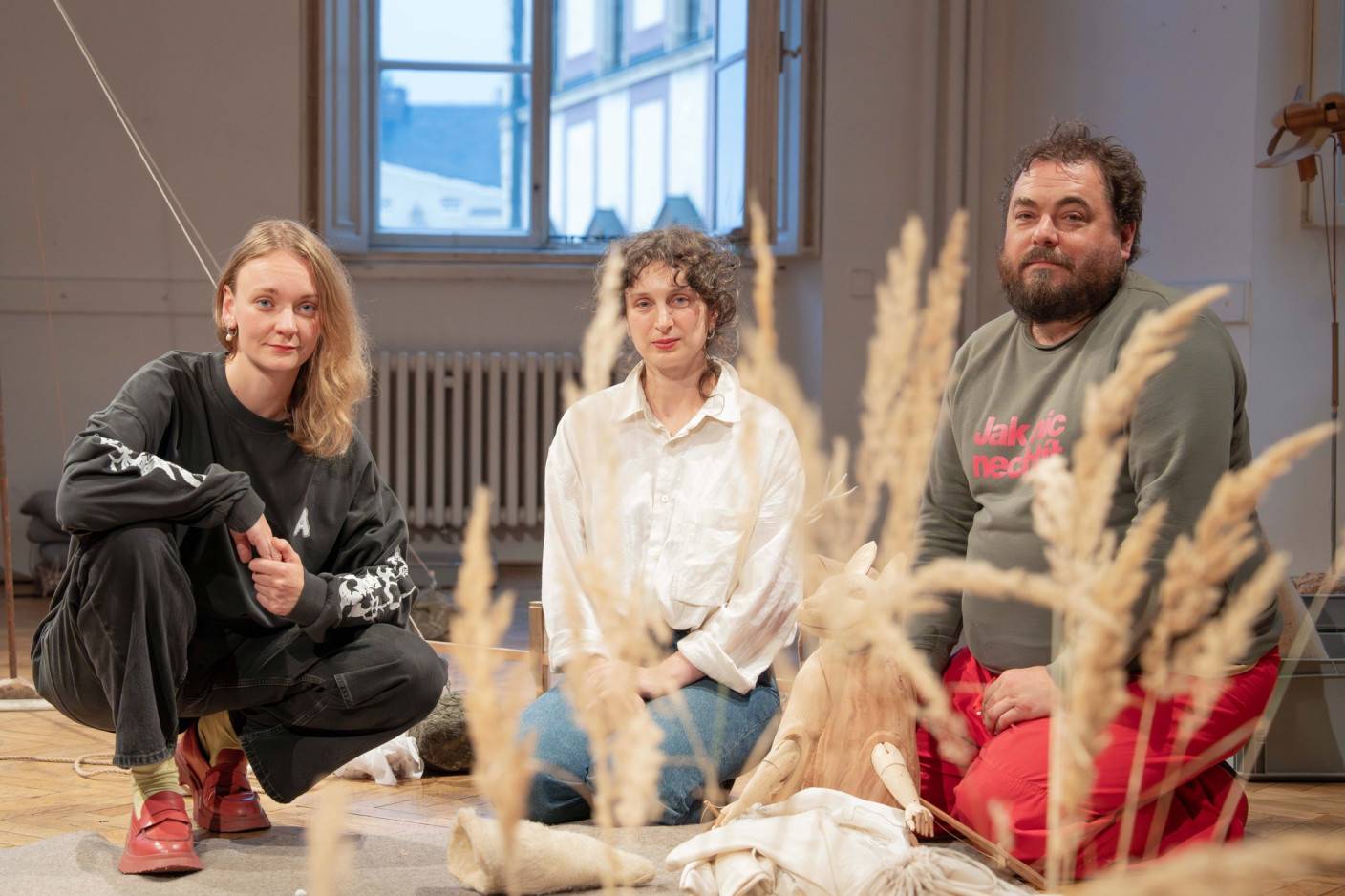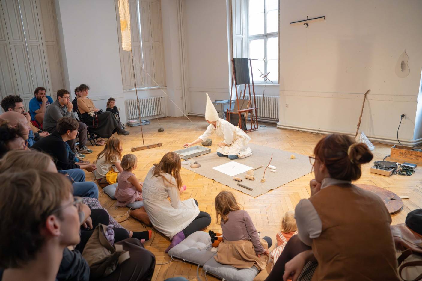In the glare of lightning, the project interweaves a theatrical performance and an exhibition into a séance, a healing ritual, or a celebration of art and creation. It invites anyone unafraid to get their hands dirty into a landscape of objects that conceal the seed of transformation. Robert Smolík and Veronika Vlková here jointly contemplate the work and legacy of the visual artist, performer, educator, and art theorist Joseph Beuys. In the 1970s, Beuys’s thinking brought about a profound shift in the perception of art—as an integral part of every person’s life and as a means of changing the world. In a quiet dialogue with his work, Smolík and Vlková seek possibilities for renewing our relationships with the Earth and its inhabitants. As an artistic duo, they thus seamlessly follow up on their previous collaboration with Terén on the production Návštěva (Visit), which was presented in South Korea, Mexico, Finland, Croatia, Slovakia, and at numerous festivals in the Czech Republic.