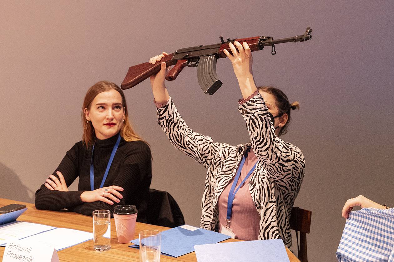 We Love Shooting is a theatre performance that deals with the issue of the arms trade.