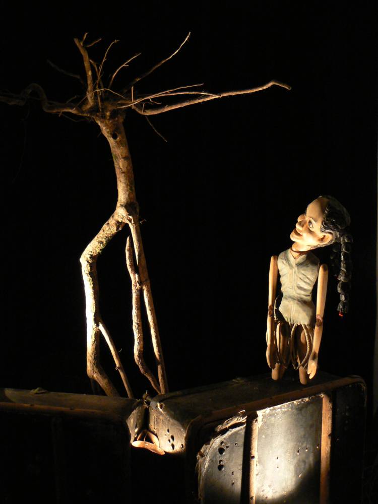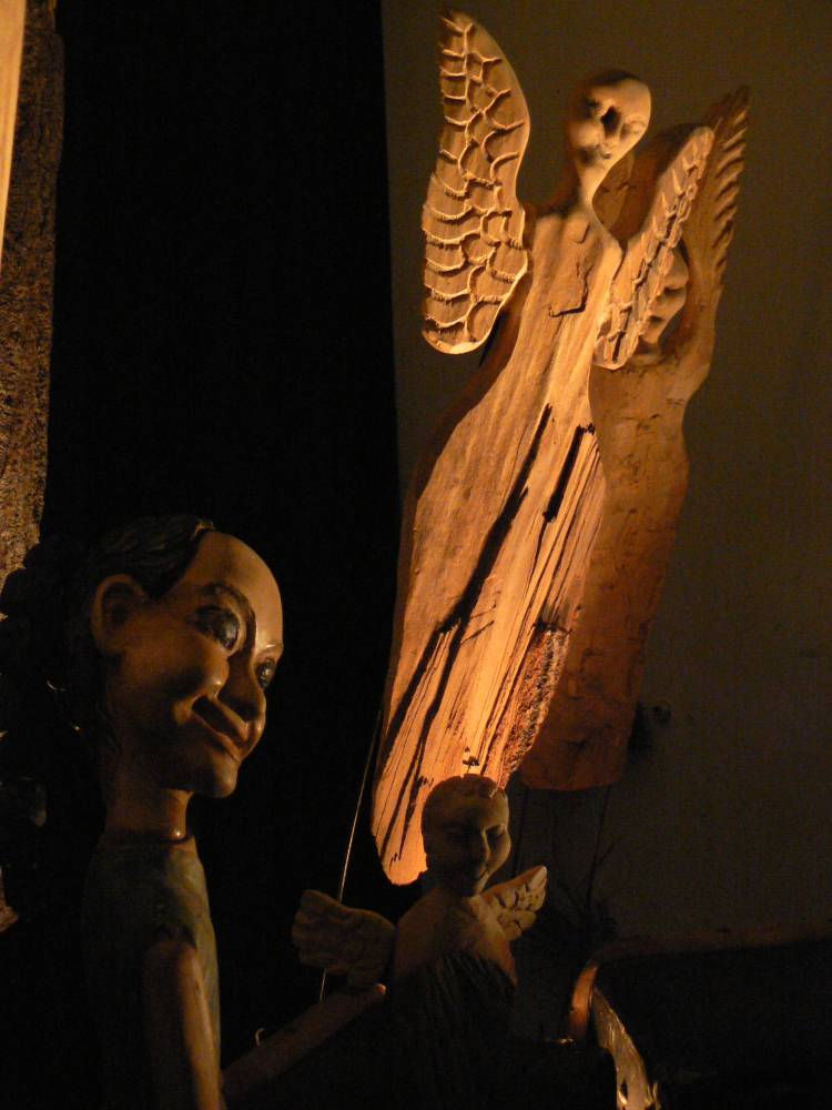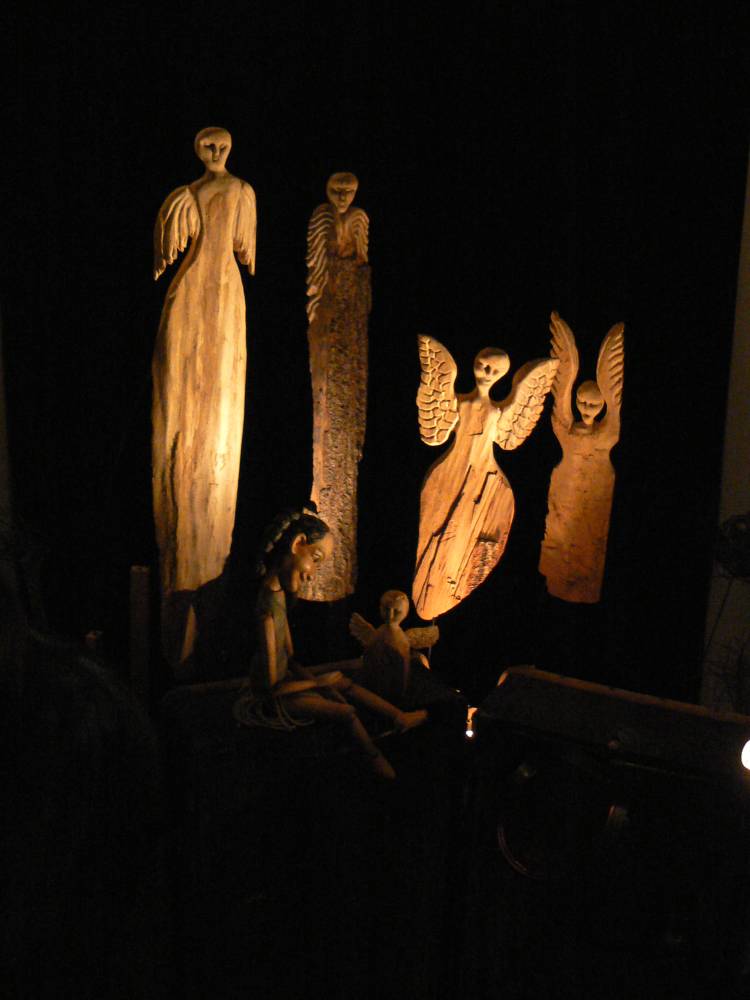 Základem scény je starý lodní kufr, upravený jako zvukový nástroj. Z kufru – lesa vystupují lesní bytosti a potkávají se s němou holčičkou. Její hra na píšťalku přiláká ptáky proměńující se v anděly. Za svou hru od nich dostane dar… Hrají ručně vyřezané dřevěné loutky, ale také samorosty, trávy a šišky – magické bytosti lesa. Po představení následuje výtvarná dílna – výroba ptáčků z klacíků a peří. Představení je pro děti od 2 let a dospělé.