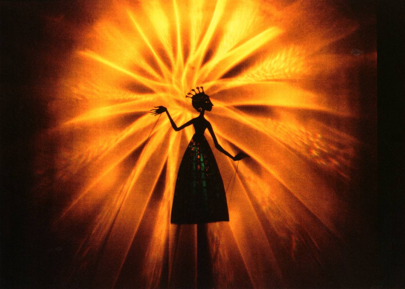 Příběh na motivy staroindické báje z Mahábháraty pojednává o lásce a síle princezny Sávitrí, která vysvobodí svého muže ze zajetí smrti. Vizuálně silný obraz barevných pohyblivých stínů na velkém plátně je doprovázen zvukově stylizovaným projevem vypravěče a hudebníka v jedné osobě ovládajícího soubor originálních, vlastnoručně vyrobených netradičních hudebních nástrojů. Výtvarná i zvuková složka inscenace je volně ovlivněna orientálním způsobem scénování a vytváří původní svébytný tvar.