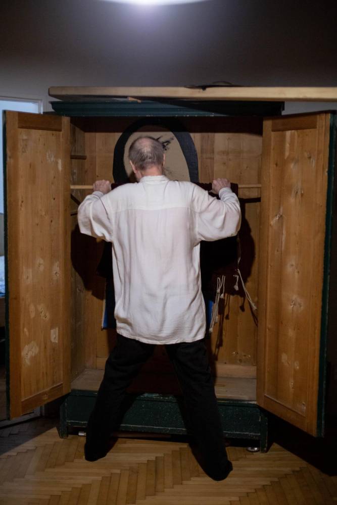 v němž je cítit každý kilogram těla, vyniká každá vráska i magická míra soustředění podbitá lety cizelování a zpřesňování, ale jeho svět je mnohem širší. V jednom krátkém časovém toku nabízí Jáno bezesporu vše, co umí. Prosmekává se od tance k rituálu, činohře, až k urputnému boji s vlastním tělem. Zastaví se na ovládnutí mála, aby pak z mála udělal překvapivé mnoho, rozpoutal skromný chaos a drobnými gesty budoval i strhával spousty neviditelných opon. K tomu si vybral spřízněného sekundanta, hudebníka Tomáše Vtípila.