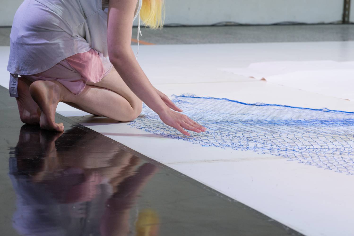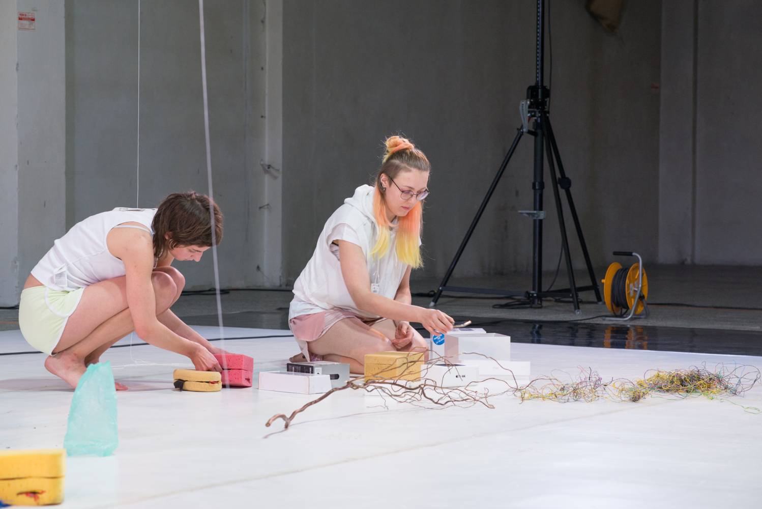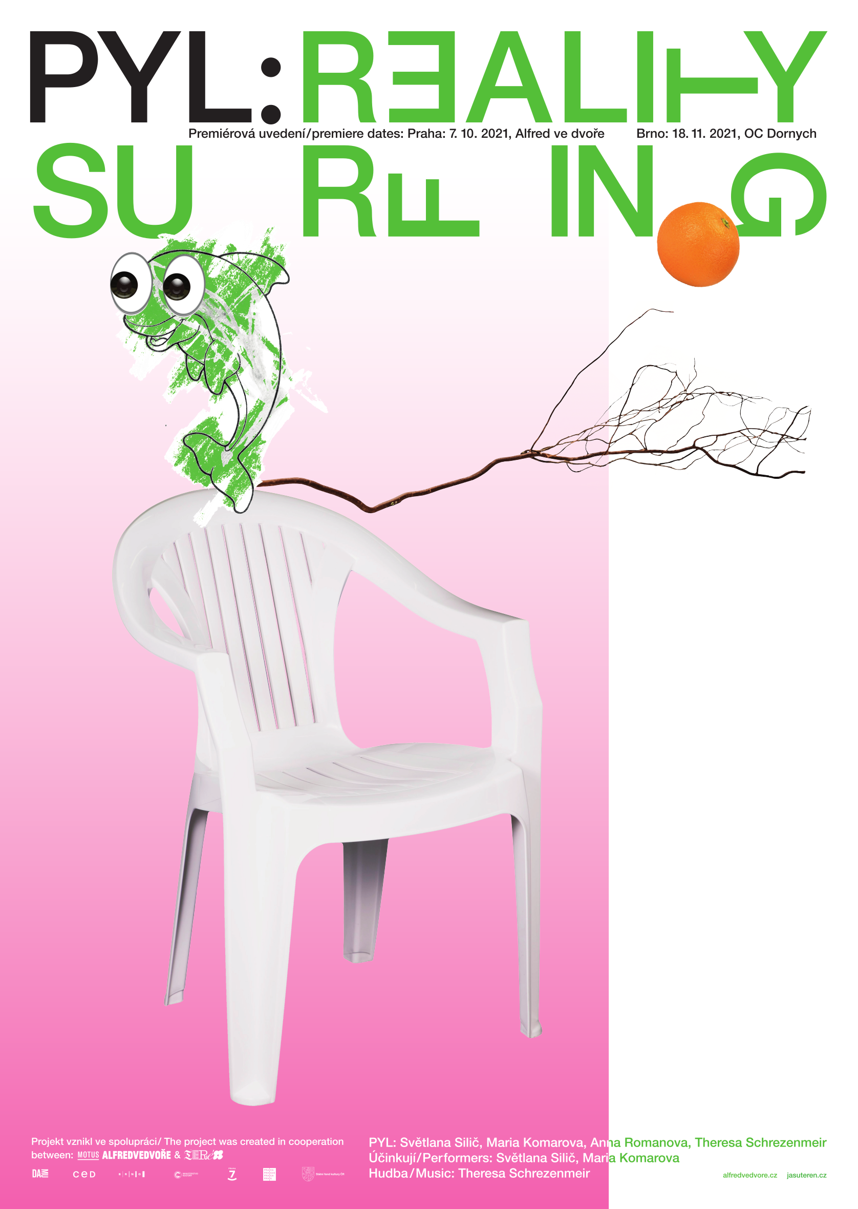 Reality Surfing je vizuální performance, která divákům nabízí alternativní model soužití lidí a neživých entit. Objevuje nové vztahy mezi předměty denní potřeby skrze jejich materialitu a přítomnost ve společném prostoru, ve kterém objekty nabývají hodnoty rovnocenné s lidskými těly. Scénografie zde vytváří systém, který funguje podle svých vlastních pravidel. Slouží a vyžaduje servis; pohlcuje a vydává; jeho geometrie je nesmyslná stejně jako destruktivní pocity. Autorky zvou diváky k prožití alternativního modelu soužití lidí a neživých bytostí a k surfování do nové reality vytvořené ve spolupráci s houbami, pomeranči, stroji, duchy a dalšími nečekanými entitami.