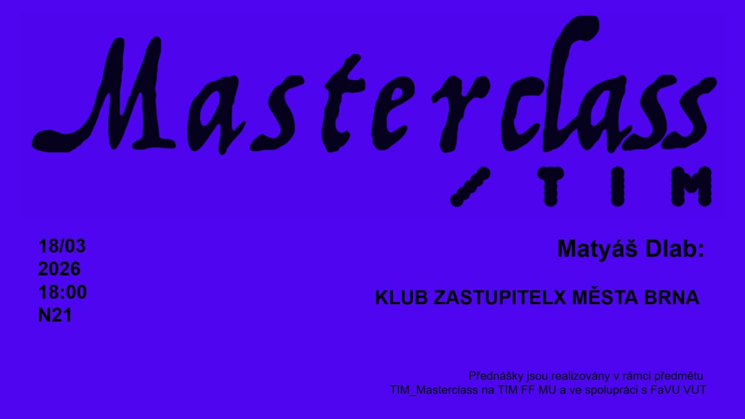 Přednáška Matyáše Dlaba v rámci TIM Masterclass představí umělecký program Terénu v prostorách Klubu zastupitelů města Brna. Přednášky jsou realizovány v rámci předmětu TIM_Masterclass na TIM FF MUNI a ve spolupráci s FaVU VUT.