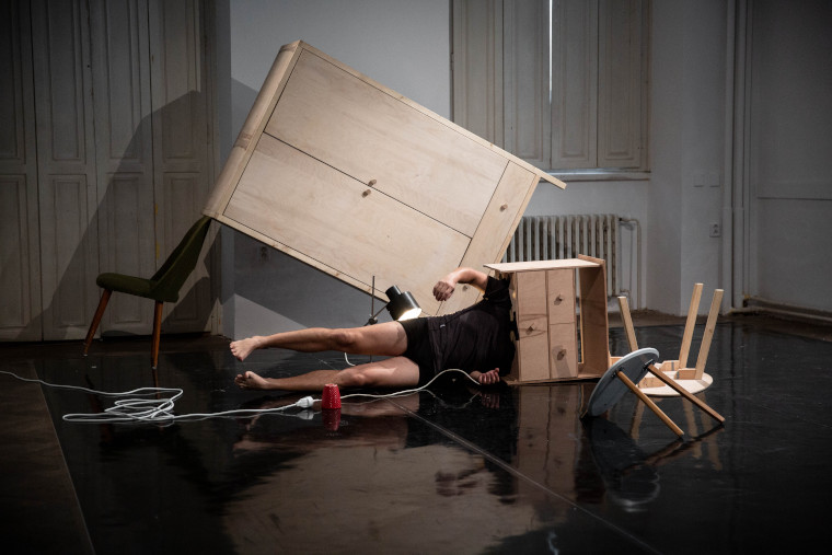 Obývací pokoj je expedicí lidské představivosti do neprobádaného teritoria nábytku. Odehrává se mezi zdmi jediné místnosti - světa nábytku existujícího paralelně vedle našeho. Tady má každý předmět svůj vlastní charakter, každý jedná svým jedinečným způsobem. Na pomezí světla a tmy, uprostřed tichého skřípání dřevěných nohou a vrzání dveří, se nábytek a lidské tělo stávají plátnem, z něhož se vynořují a zase ztrácejí fantastické figury. Lukáš Karásek ve svém projektu balancuje na hraně divadla masek, tance a cirkusu, a rozehrává vzrušující hru plnou imaginace a humoru.