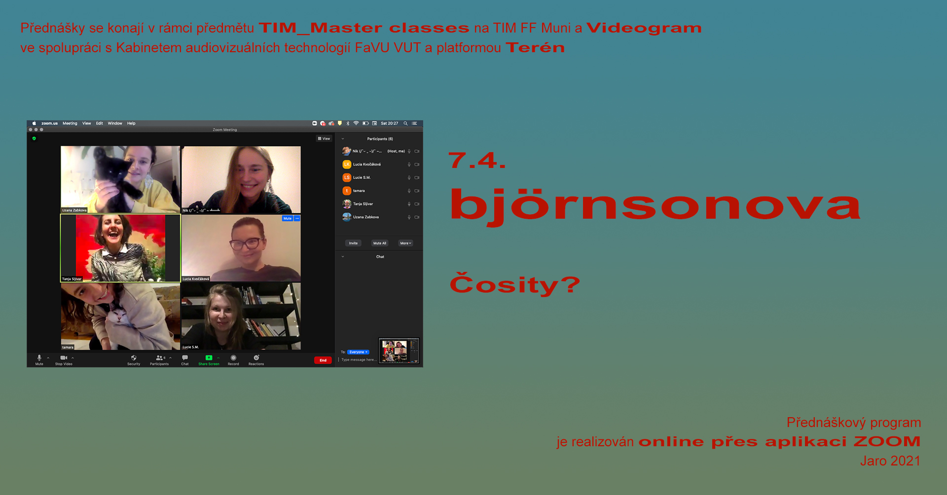 Přednáška je součástí cyklu přednášek TIM Master Class & videogram (předmět vyučován v rámci oboru Teorie interaktivních médií na FF MUNI, Videogram FaVU VUT & ve spolupráci s platformou Terén). Přednášky z předchozích semetrů najdete na youtube TIM.